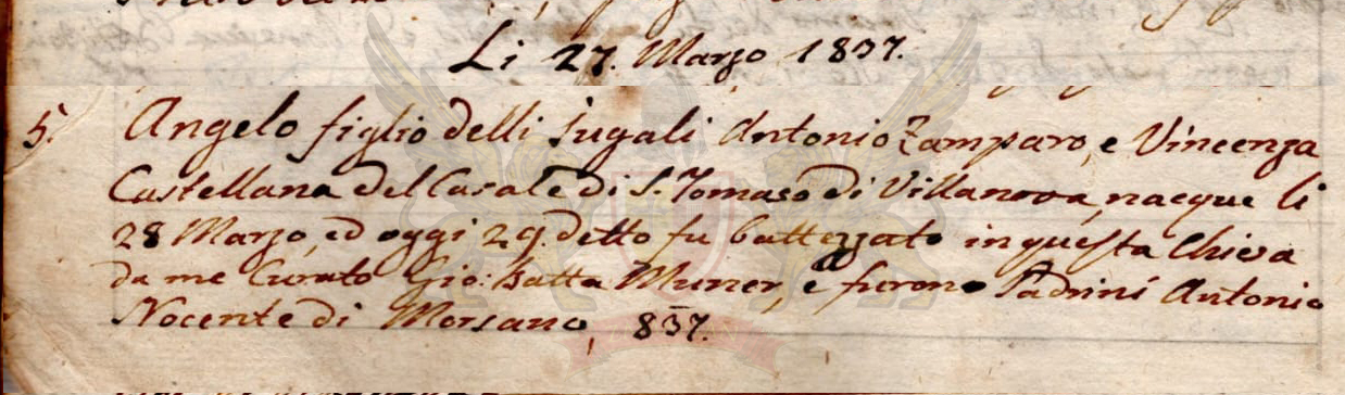 Angelo filho dos cônjuges Antonio Zamparo, e Vincenza Castellana del Casale de San Tommaso de Villanova, nasce dia 28 de Março, e hoje 29 dito foi batizado nesta Igreja por mim Curador Giovanni Battista Mainer, e foram padrinhos Antonio Nocento de Morsano, 837.