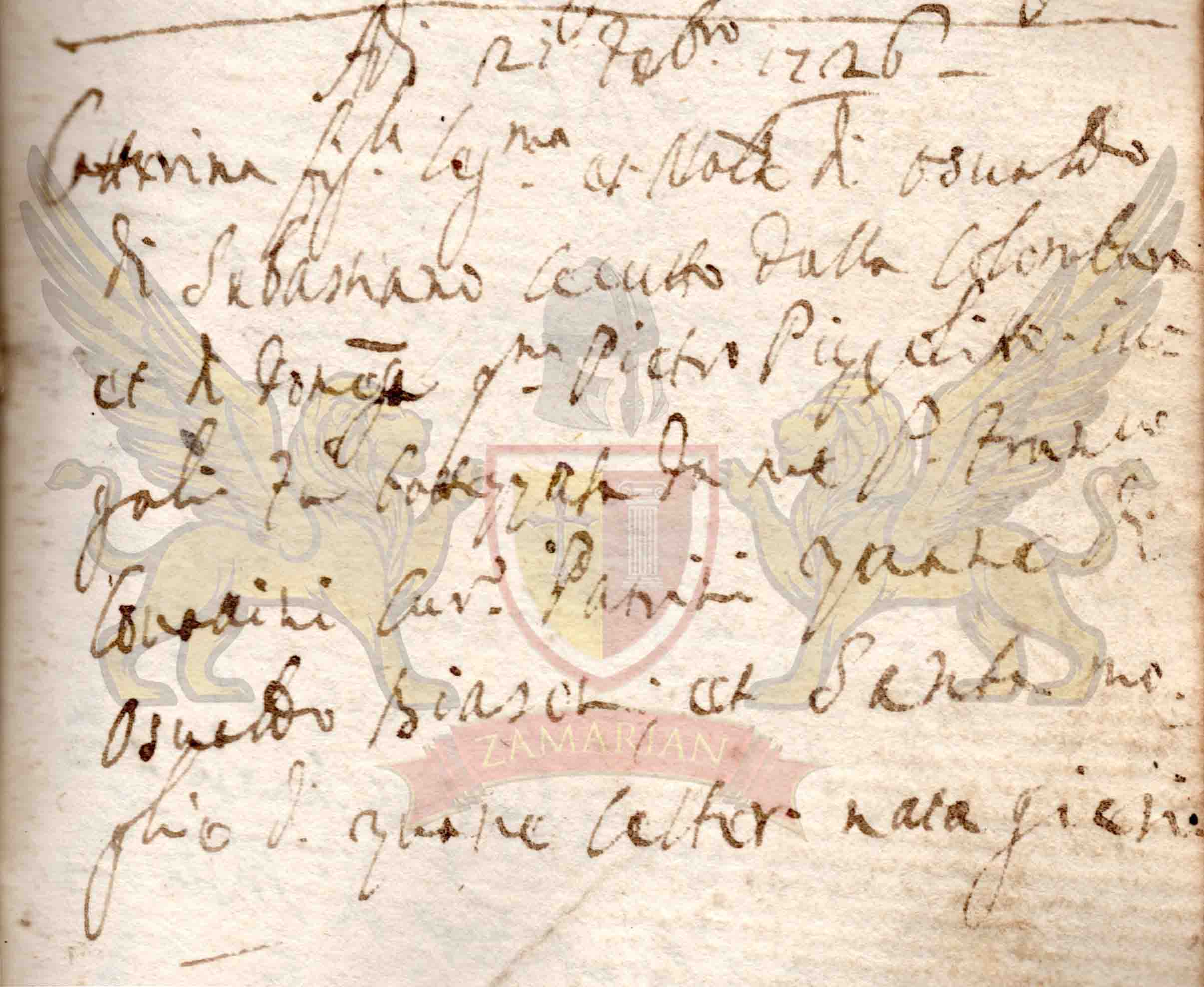Caterina filha legítima e Nascida de Osvaldo (filho) de Sebastiano Cecutto de Colombara e de Domenica (filha) do falecido Pietro Pizzolitto, cônjuges. Foi Batizada por mim Padre Francesco Covassini Curador. Padrinhos Zuane (Giovanni) (filho) de Osvaldo Biason e Santa esposa de Zuane (Giovanni) Celter. Nascida ontem.