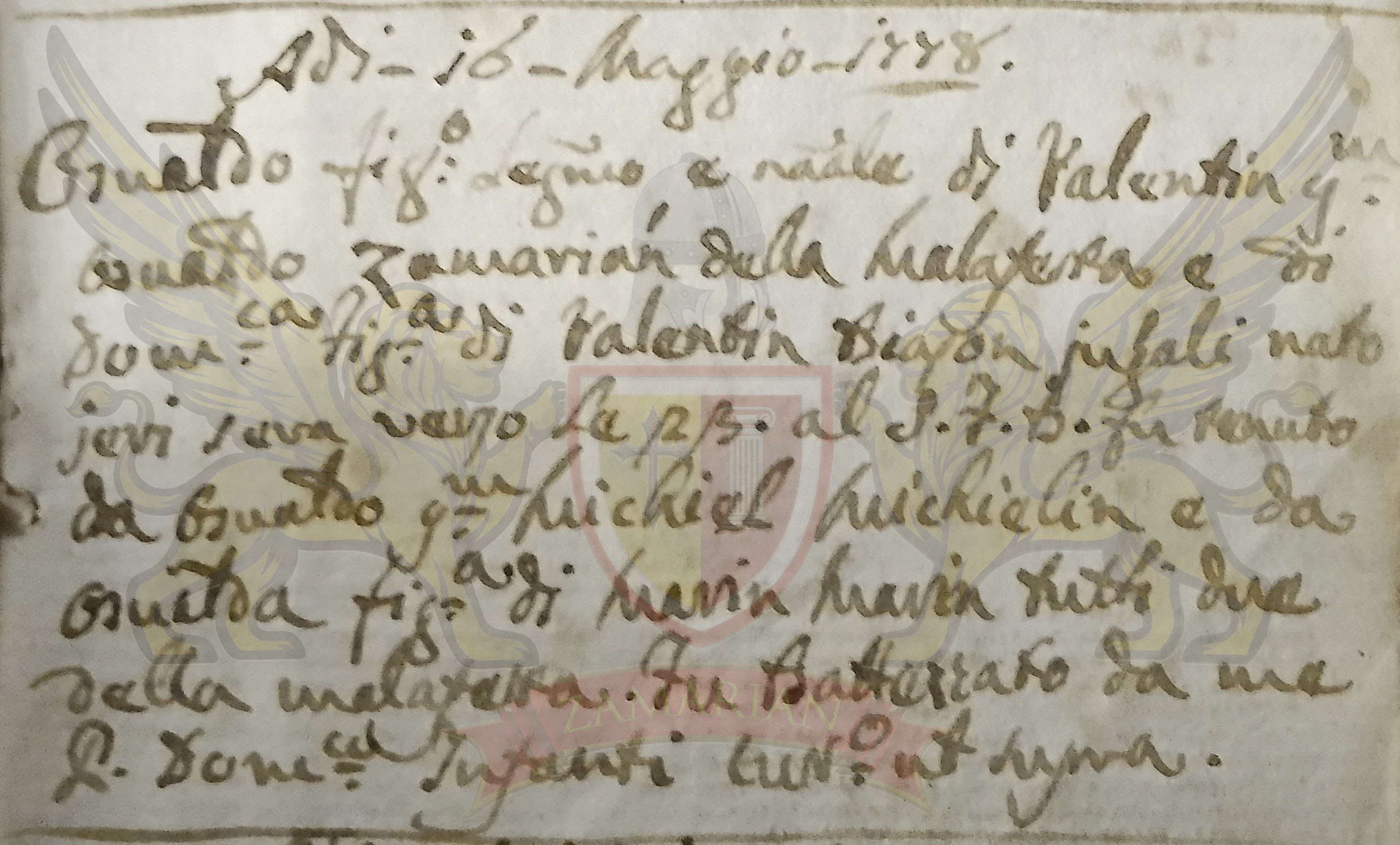 Osvaldo filho legítimo e natural de Valentin (filho) do falecido Osvaldo Zamarian da Malafesta e de Domenica filha de Valentin Biason cônjuges, nascido ontem a noite próximo das 23 horas. À Sacra fonte Batismal foi segurado por Osvaldo (filho) do falecido Michele Michelin e de Osvalda filha de Giovanni Maria Marin todos dois de Malafesta. Foi batizado por mim Padre Domenico Infanti Curador.