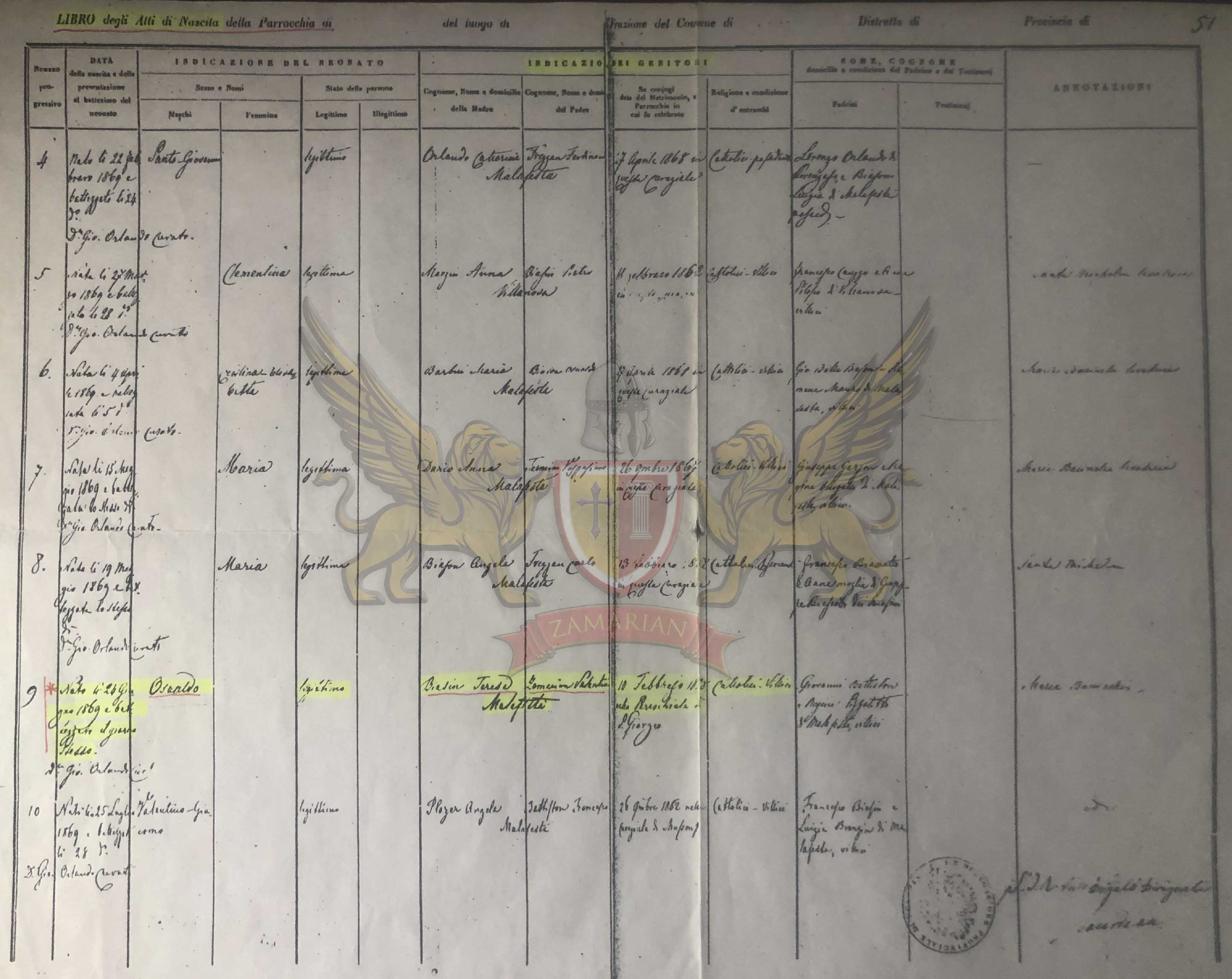 Nascido no dia 24 de Junho de 1869 e batizado no mesmo dia aos cuidados de D. Gio. Orlando Curador, filho legítimo, de Biasin Teresa e Zamarian Valentino, domiciliados em Malafesta, casados no dia 10 de fevereiro de 1858, na Paróquia de S. Giorgio, de religião Católico, de profissão camponês, de padrinhos Giovanni Battiston e Regina Pizzolitto, ambos residentes em Malafesta de profissão camponeses.