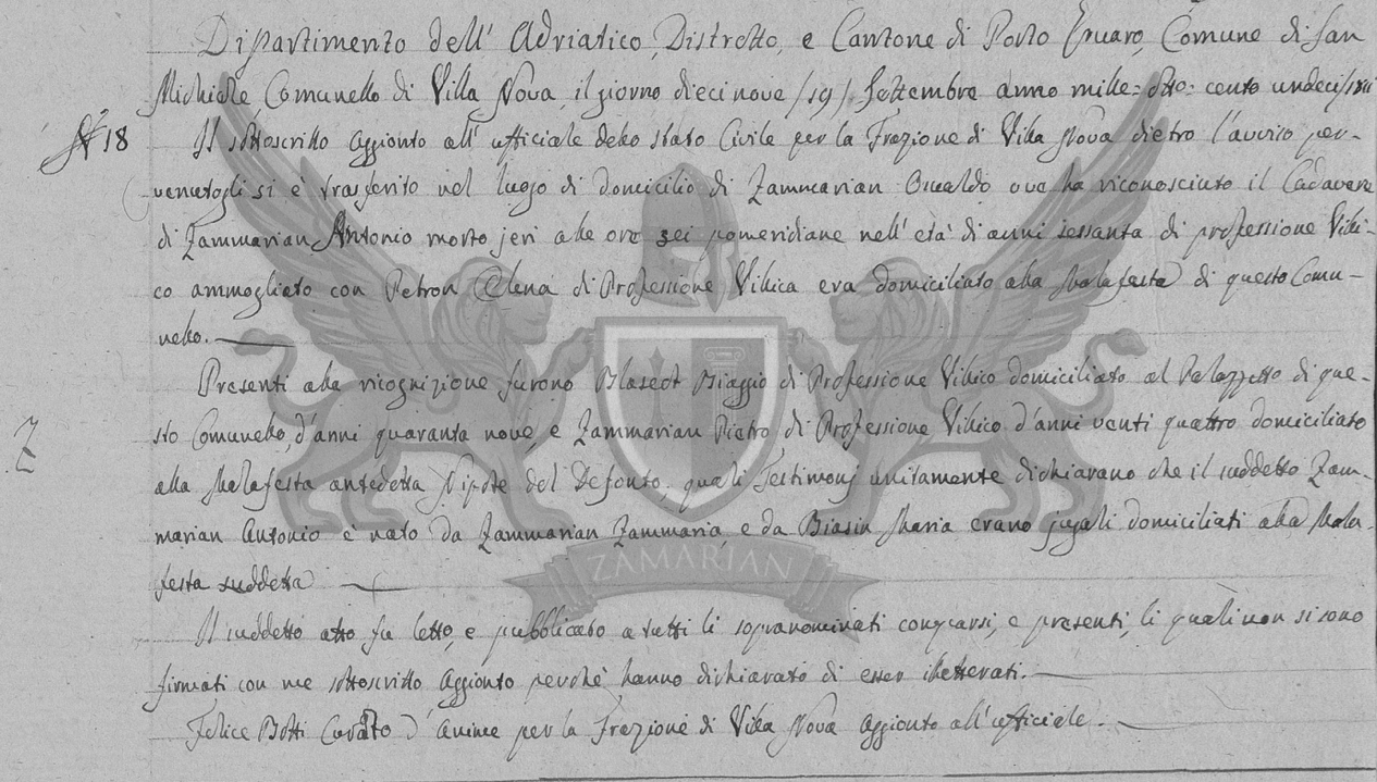 Il sottoscritto aggiunto all’ufficiale dello stato Civile per la Frazione di Villa Nova dietro l’aviso pervenutogli si è trasferito nel luogo di domicilio di Zammarian Osvaldo ove la riconosciuto il Cadavere di (1751) di Zammarian Antonio morto ieri alle ore sei pomeridiane nell’età di anni sessanta di professione Villico ammagliato con Petron Elena di Professione Villica era domiciliato alla Malafesta di questo comunello.
