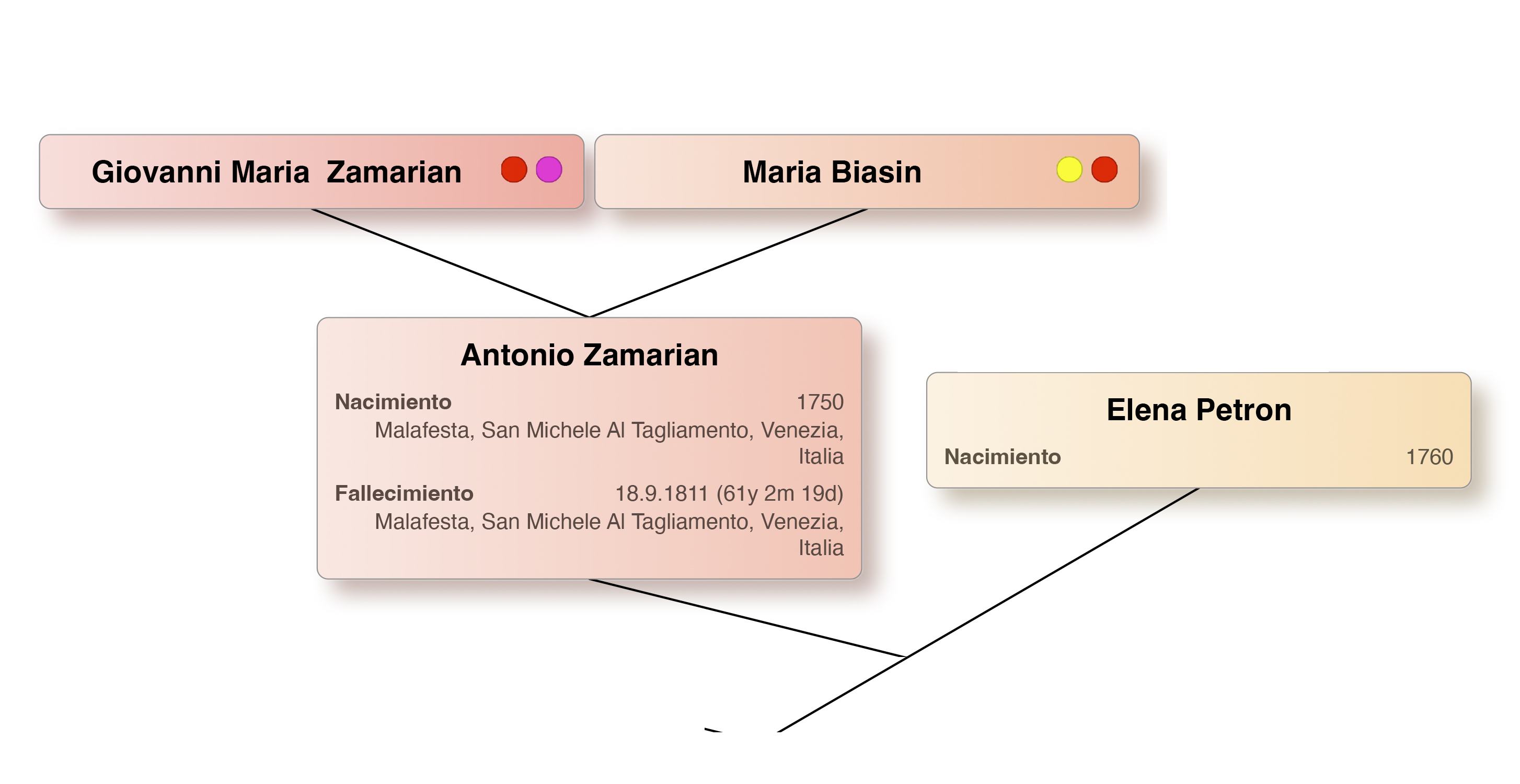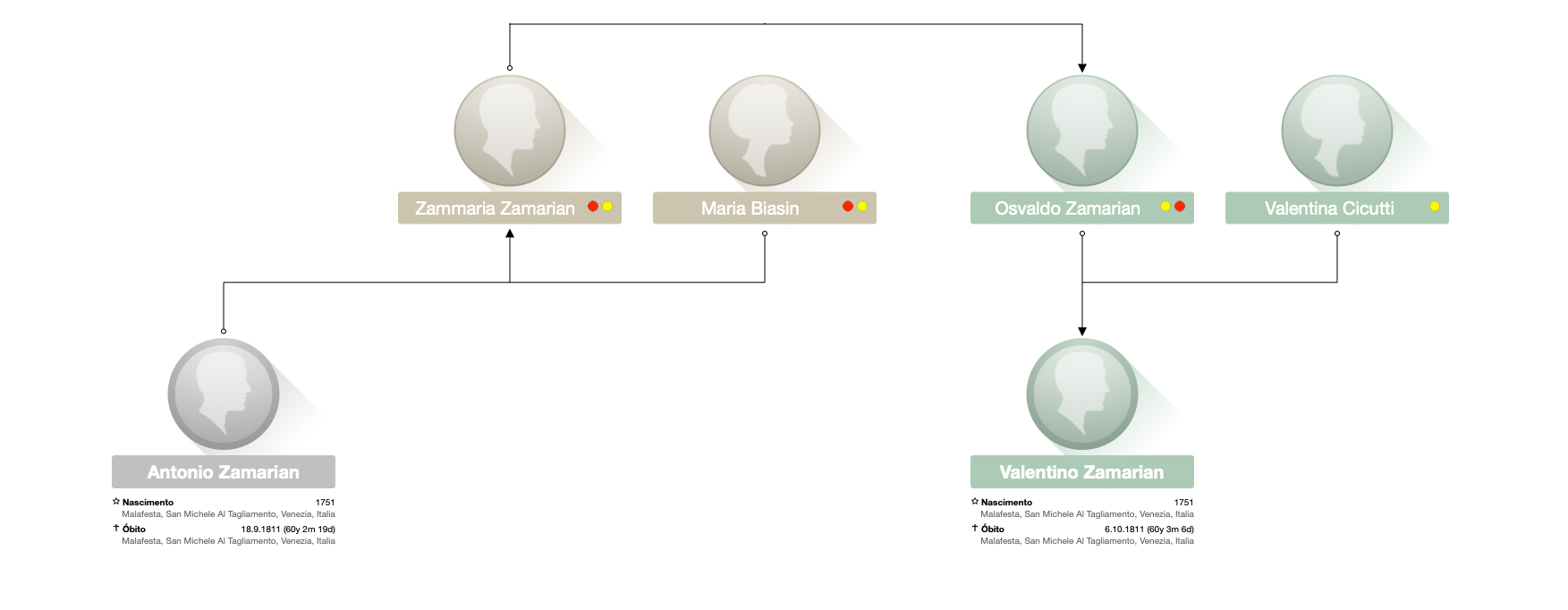 Nosso diagrama genealógico então começa a ganhar forma a partir desses dados, com um pouco de estranheza para o nome “Zammaria”, que no dialeto veneto significa Giovanni Maria (João Maria), Zan (João).