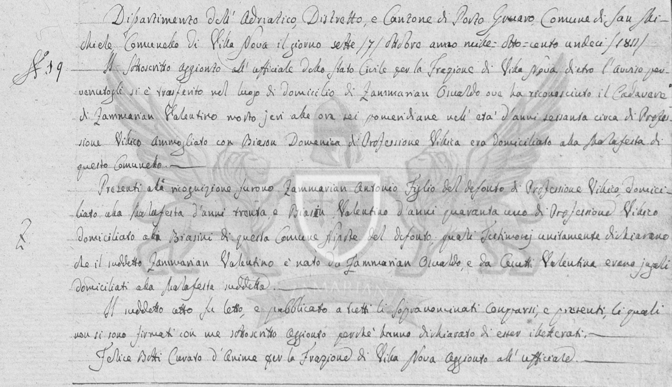 Dipartimento dell’Adriatico, Distretto e Cantone di Porto Gruaro, comune di San Michele, comunello di Villa Nova, il giorno dieci nove / 19 / Settembre anno mille otto cento undici / 1811.