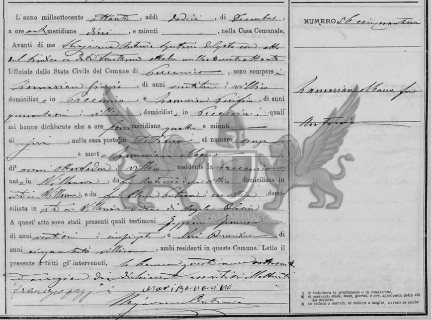 Avanti di me Sbrajavacea Antonio segretario delegato con atto omologato trentuno ottobre mille ottocento ottanta del Ufficiale dello Stato Civile del Comune di Precenicco, sono comparsi (1856) Zamarian Giorgio, di anni, ventitré, villico, domiciliato in Precenicco, e Zamarian Pacifico, di anni quaranta sei, villico domiciliato in Precenicco, i quali mi hanno dichiarato che a ore pomeridiane quattro e minuti zero di ieri, nella casa posta in Titiano al numero senza, è morto Zamarian Marco di anni ottanta due, villico, residente in Precenicco nato in Villanova, da fu Antonio, era villico, domiciliato in Villanova, e da fu Elena Petron, era villica, domiciliata in detta Villanova, vedovo di Angela Biasin.