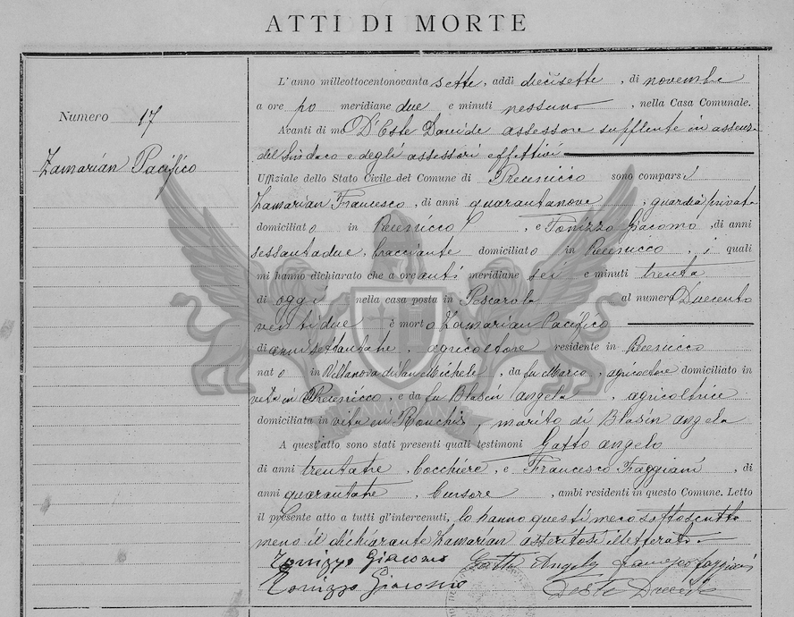 Avanti di me D’Este Davide assessore supplente in assenza del Sindaco e degli assessori effettivi Ufficiale dello Stavo Civile del Comune di Precenicco, sono comparsi (1847) Zamarian Francesco, di anni, quarantanove, guardia privato, domiciliato in Precenicco, e (1835) Tonizzo Giacomo, di anni sessantadue, bracciante domiciliato in Precenicco, i quali mi hanno dichiarato che a ore anti meridiane sei e minuti trenta di oggi, nella casa posta in Pescarola al numero duecento ventidue, è morto Zamarian Pacifico di anni settantatré, agricoltore, residente in Precenicco nato in Villanova di San Michele, da fu Marco, agricoltore, domiciliato in vita in Precenicco, e da fu Blasin Angela, agricoltrice, domiciliata in vita in Ronchis, marito di Blasin Angela.