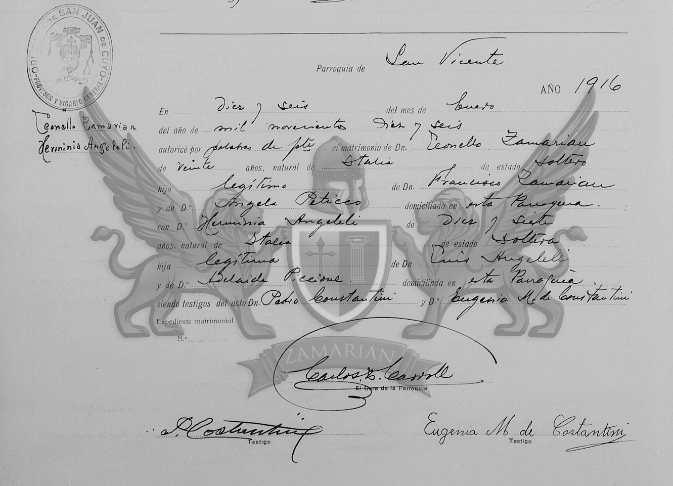 En diez y seis del mes de Enero del año mil novecientos diez y seis autoricé por palabras de ? el matrimonio de Dn. Leonello Zamarian de veinte años, natural de Italia de estado soltero hijo legitimo de Dn. Francisco Zamarian y de D.ª Angela Peticco domiciliado en esta Parroquia con D.ª Herminia Angeleli de diez y siete años, natural de Italia de estado soltera hija legitima de Dn. Luis Angeleli y de D.ª Adelaide Piccione domiciliada en esta Parroquia.