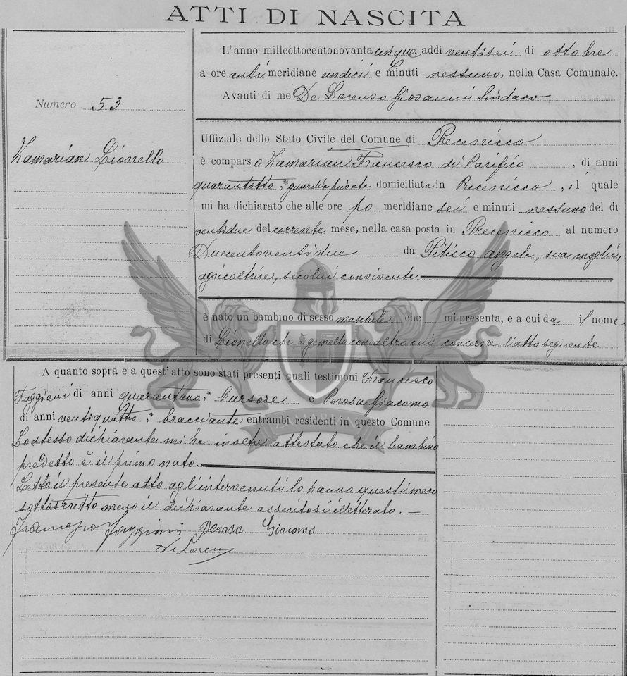 Avanti di me De Lorenzo Giovanni Sindaco Ufficiale dello Stato Civile del Comune di Precenicco, è comparso Zamarian Francesco di Pacifico, di anni, quarantaquattro, guardia privato, domiciliato in Precenicco, il quale mi ha dichiarato che a ore pomeridiane sei e minuti cinque del dì ventidue, del corrente mese, nella casa di Precenicco al numero Duecentoventidue, da Piticco Angela, sua moglie, agricoltrice, se co lui convivente.