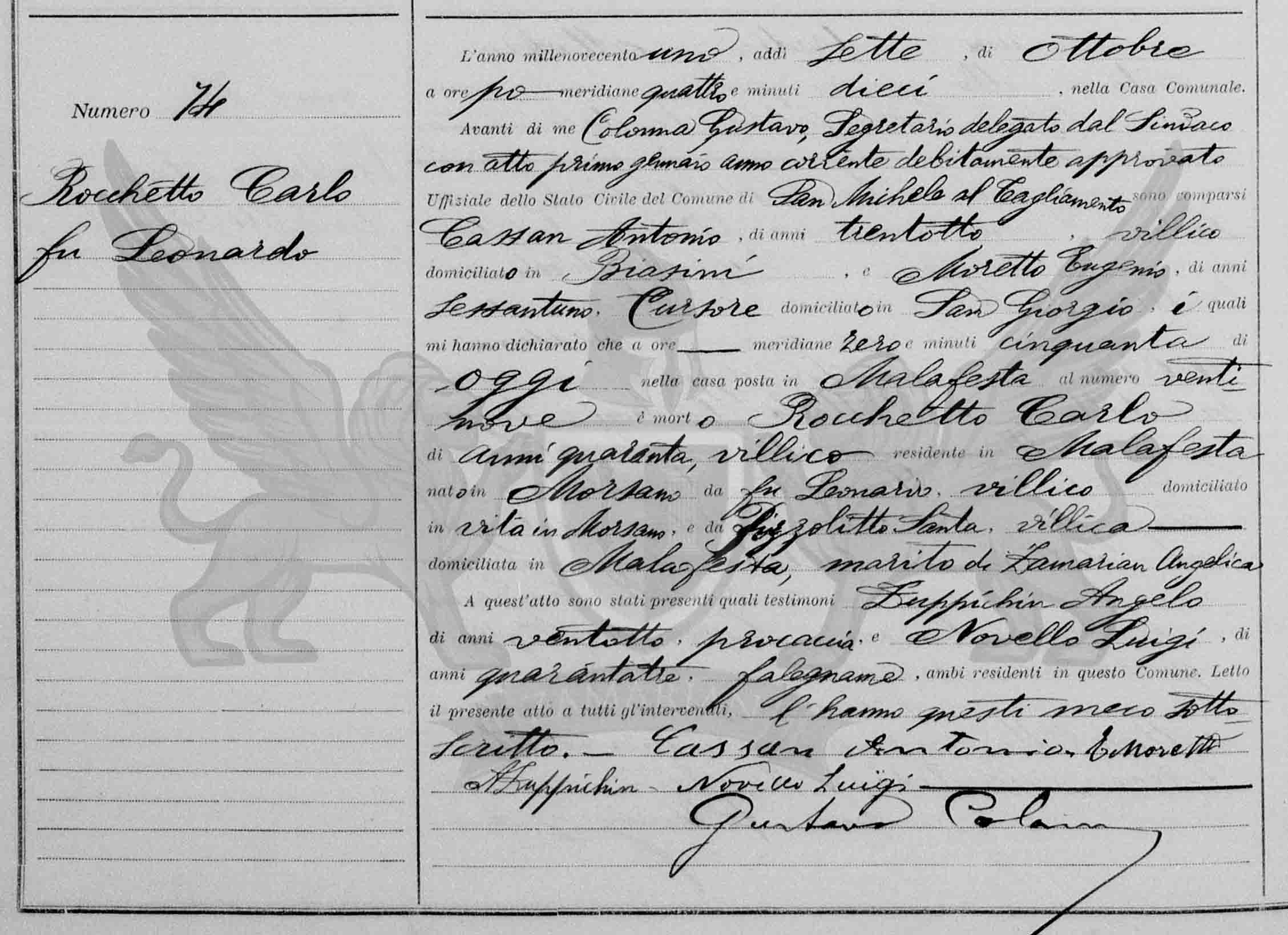 Diante de mim Colonna Gustavo, Secretário delegado do Síndico com ato primeiro de janeiro do ano corrente devidamente aprovado Oficial do Estado Civil do Município de San Michele al Tagliamento, compareceram Cassan Antonio, de trinta e oito anos, camponês, domiciliado em Biasini, e Moretto Eugenio, de sessenta e um anos, cursor, domiciliado em San Giorgio, os quais me declararam que às meridiana zero hora e cinquenta minutos, de hoje, na casa situada em Malafesta, ao número vinte e nove, faleceu Rocchetto Carlo, de quarenta anos, camponês, residente em Malafesta, nascido em Morsano, (filho) do falecido Leonardo, camponês, domiciliado em vida em Morsano, e de Pizzolitto Santa, camponesa, domiciliada em Malafesta, marido de Zamarian Angela.