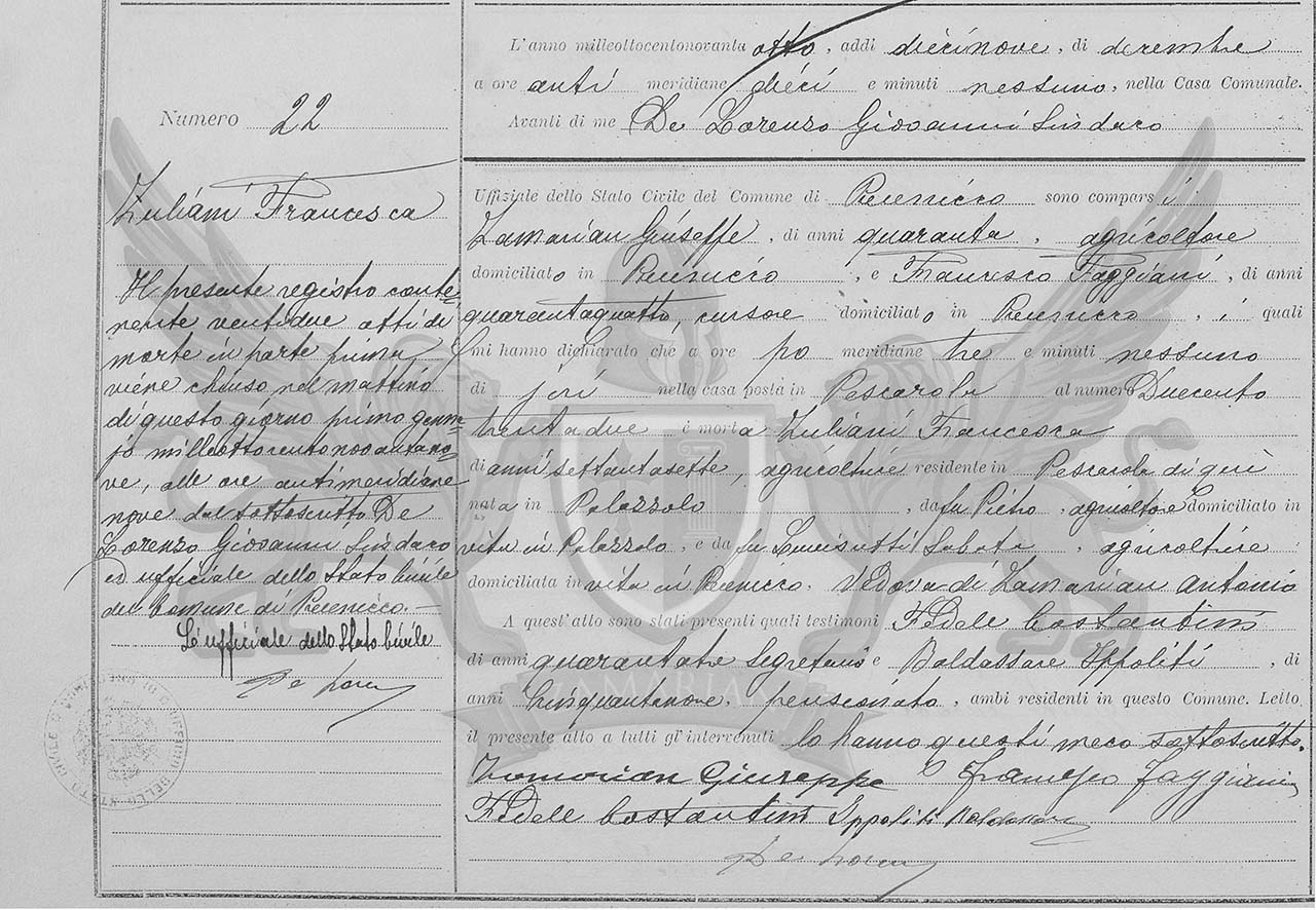 Diante de mim De Lorenzo Síndico Oficial do Registro Civil do Município de Precenicco, compareceram Zamarian Giuseppe, de quarenta anos, agricultor, domiciliado em Precenicco, e Francesco Faggiani, de quarenta e quatro anos, cursor, domiciliado em Precenicco, os quais me declararam que às três horas da tarde, de ontem, na casa situada em Pescarola, ao número duzentos e trinta e dois, faleceu Zuliani Francesca, de setenta e sete anos, agricultora, residente em Pescarola daqui, nascida em Palazzolo, filha do finado Pietro, agricultor, domiciliado em vida em Palazzolo, e da finada Luvisutti Sabata, agricultora, domiciliada em vida em Precenicco, viúva de Zamarian Antonio.