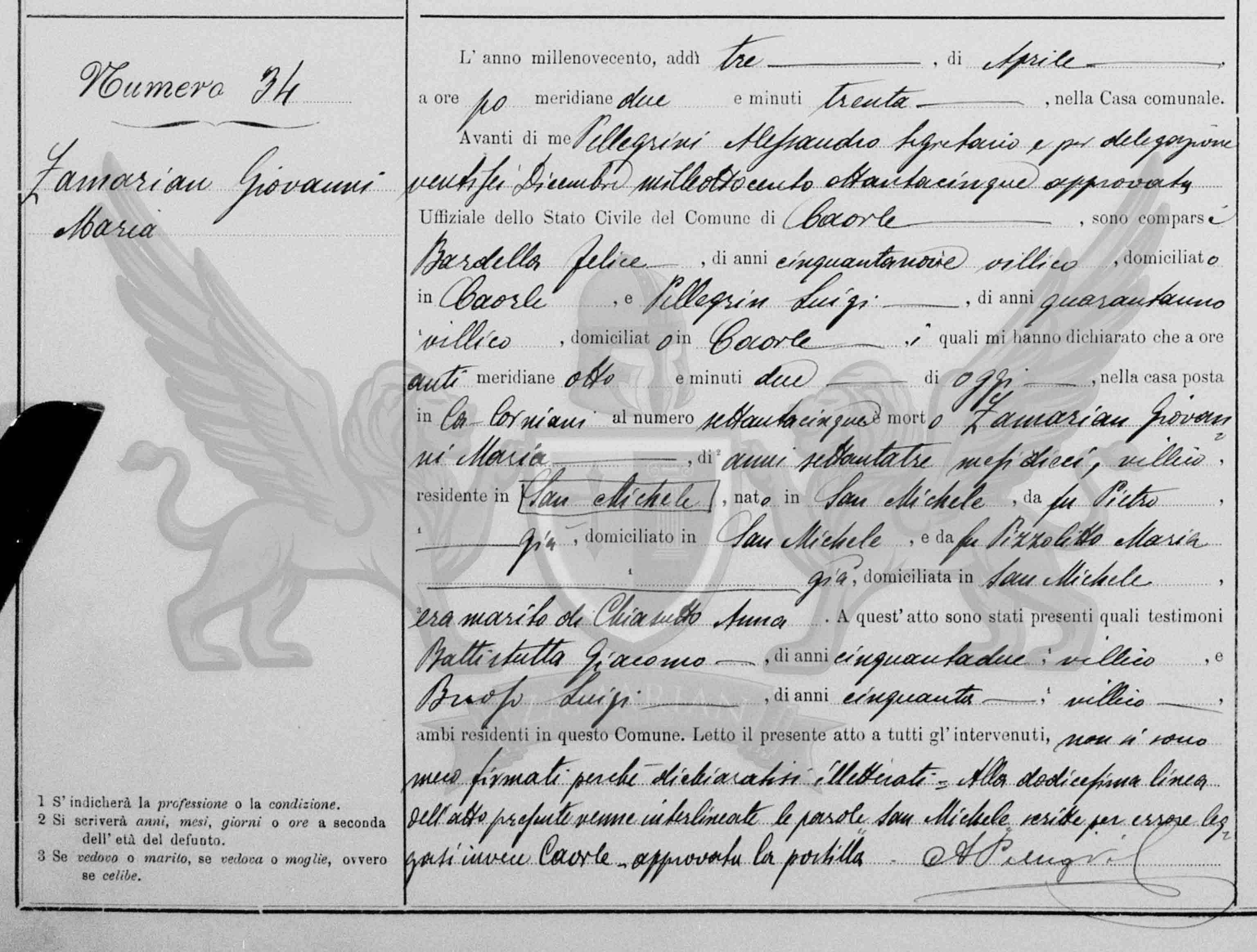Diante de mim Pellegrini Alessandro secretário e por delegação vinte e seis de dezembro de mil oitocentos e oitenta e cinco aprovado Oficial do Estado Civil do Município de Caorle, compareceram Bardella Felice, de cinquenta e nove anos camponês, domiciliado em Caorle, e Pellegrini Luigi, de quarenta e um anos camponês, domiciliado em Caorle, os quais me declararam que as antimeridianas oito horas e dois minutos de hoje, na casa situada em Ca' Corniani ao número setenta e cinco faleceu Zamarian Giovanni Maria, de setenta e três anos e dez meses, camponês residente em § San Michele §, nascindo em San Michele, filho do finado Pietro foi, domiciliado em San Michele, e da finada Pizzolitto Maria foi, domiciliada em San Michele, era marido de Chiasutto Anna.