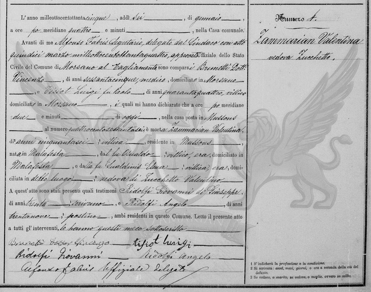 Diante de mim Alfonso Fabris secretário delegado do Síndico com ato dia quinze de março de mil oitocentos e oitenta e quatro, aprovado Oficial do Registro Civil do Município de Morsano al Tagliamento, compareceram Brunetti Dot. Vincenzo, de sessenta e cinco anos, médico, domiciliado em Morsano, e Tisiot Luigi filho do finado Paolo, de quarenta e quatro anos, camponês, domiciliado em Morsano, os quais me declararam que as duas horas da tarde de hoje na casa situada em Mussons ao número quatrocentos e sessenta e seis, faleceu Zammarian Valentina de cinquenta e seis anos, camponesa, residente em Mussons nascida em Malafesta, filha do finado Osvaldo, camponês, domiciliado em Malafesta, e da finada Svaldinis Elena, camponesa, era domiciliada no referido lugar, viúva de Zucchetto Valentino.