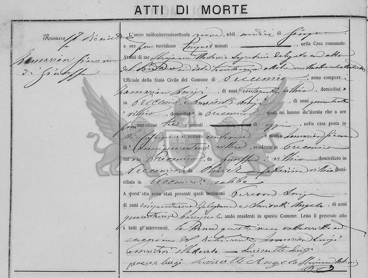 Diante de mim Sbrojavacea Antonio secretário delegado do Síndico na data de trinta e um de outubro de mil oitocentos e setenta e sete devidamente aprovado Oficial do Registro Civil do Município de Precenicco, compareceram Zamarian Luigi, de trinta e quatro anos, camponês, domiciliado em Precenicco, e Luvisutti Luigi, de quarenta e quatro anos, camponês, domiciliado em Precenicco, os quais me declararam que as três horas da tarde, de hoje na casa situada em Via Casenove, ao número cento e nove faleceu Zamarian Giacomo de quarenta e nove anos, camponês, residente em Precenicco nascido em Precenicco, filho de Giuseppe, camponês, domiciliado em Precenicco, e de Olivier Catterina, camponesa, domiciliada no referido lugar, solteiro.