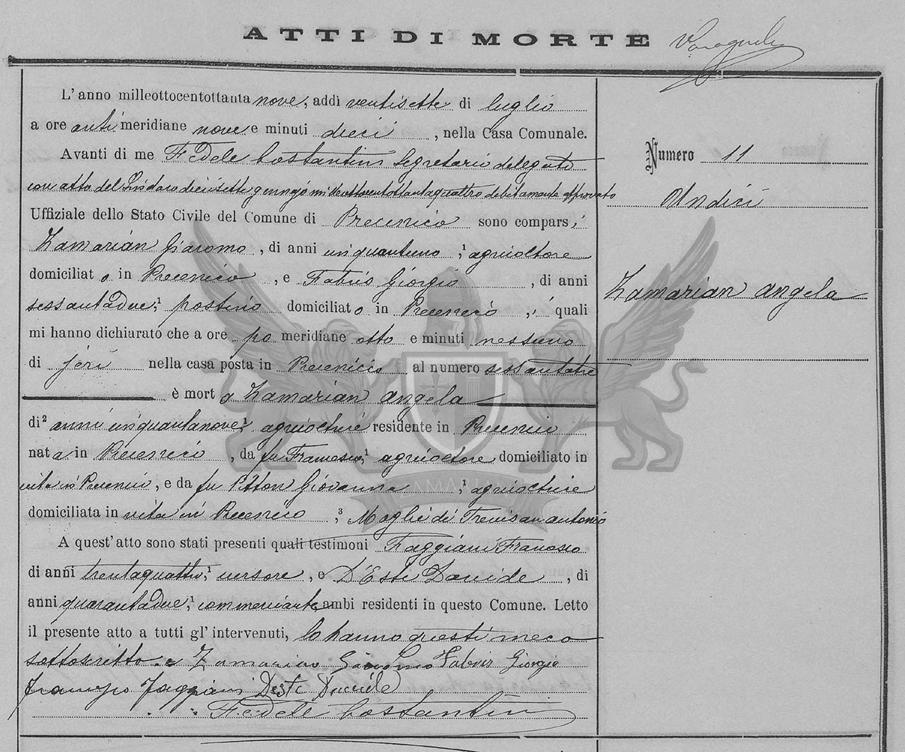 Diante de mim Fedele Costantini secretário delegado com ato do Síndico dia dezessete de janeiro de mil oitocentos e oitenta e quatro devidamente aprovado Oficial do Registro Civil do Município de Precenicco, compareceram Zamarian Giacomo, de cinquenta e um anos, agricultor, domiciliado em Precenicco, e Fabris Giorgio, de sessenta e dois anos, carteiro domiciliado em Precenicco, os quais me declararam que as oito horas da noite, de ontem na casa situada em Precenicco, ao número setenta e três, faleceu Zamarian Angela de cinquenta e nove anos, agricultora, residente em Precenicco nascida em Precenicco, filha do finado Francesco, agricultor, domiciliado em vida em Precenicco, e da finada Pitton Giovanna, agricultora, domiciliada em vida em Precenicco, mulher de Trevisan Antonio.