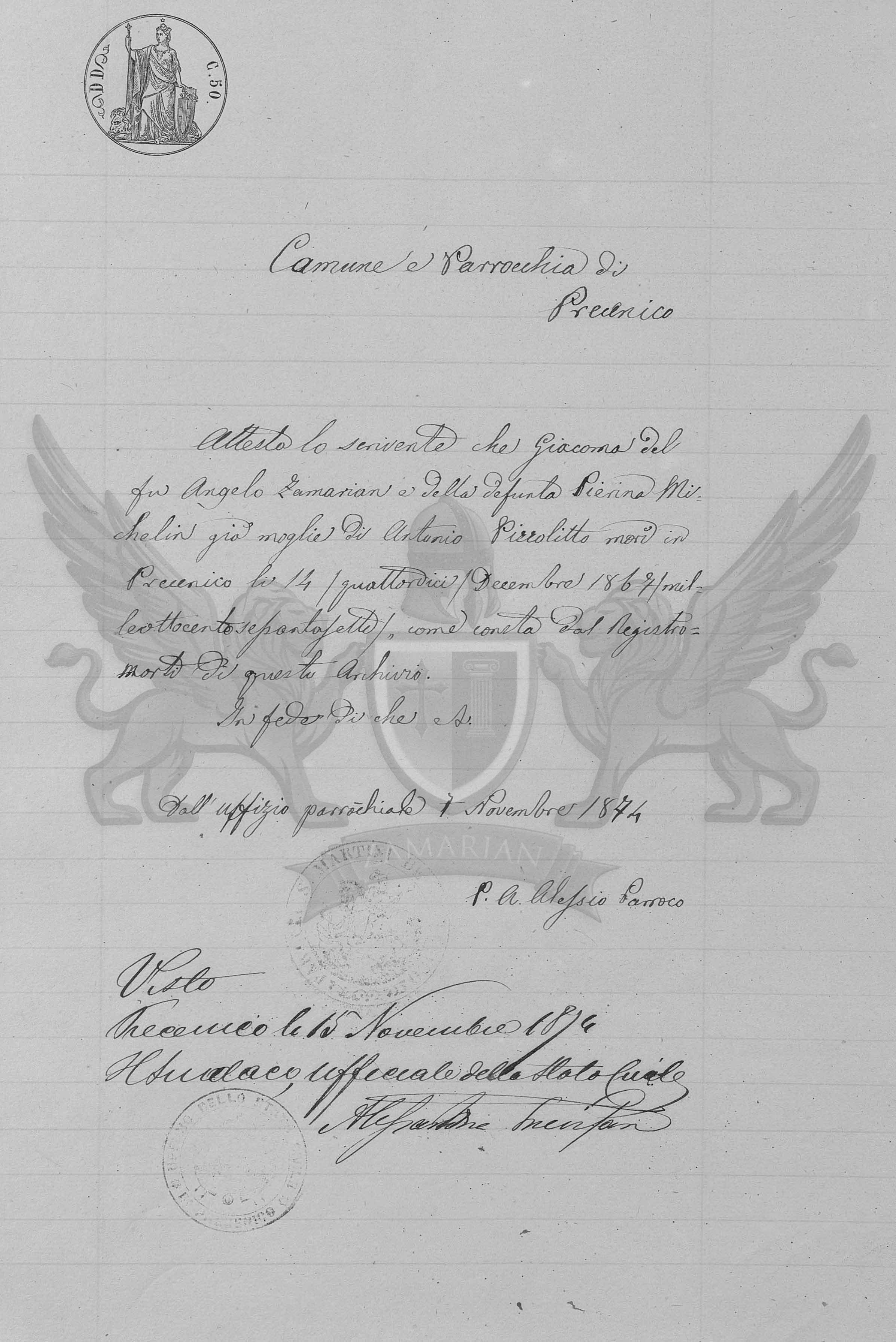Atesta o subscrito que Giacoma filha do finado Angelo Zamarian e da finada Pierina Michelin então mulher de Antonio Pizzolitto faleceu em Precenicco dia 14 /quatorze/ de Dezembro de 1867 /mil oitocentos e sessenta e sete, como consta do Registro de Falecimentos deste Arquivo.