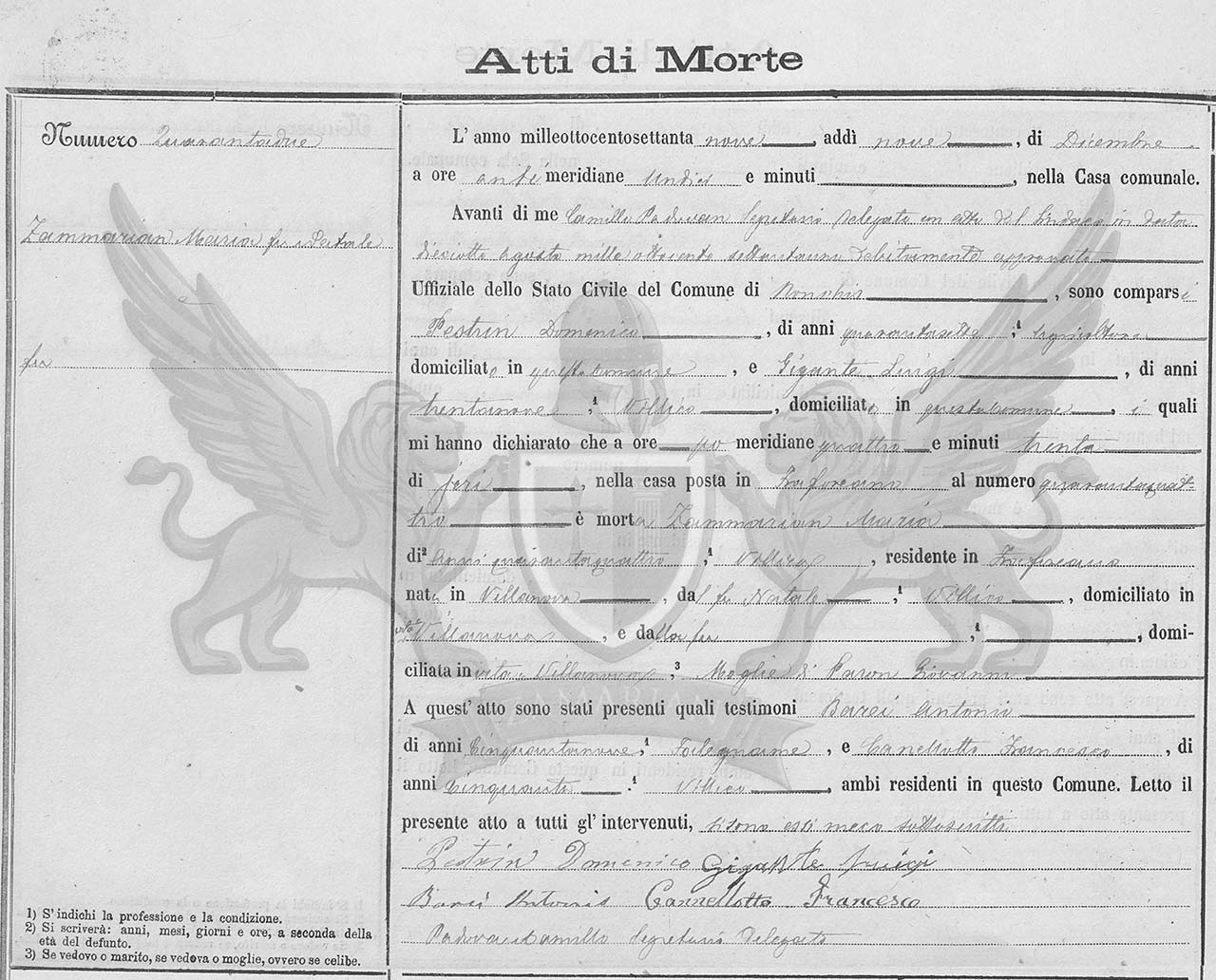 Diante de mim Camilo Padovan secretário delegado com ato do Síndico na data dezoito de agosto de mil oitocentos e setenta e um, devidamente aprovado Oficial do Registro Civil do Município de Ronchis, compareceram Pestrin Domenico, de quarenta e sete anos, agricultor, domiciliado neste município, e Gigante Luigi, de trinta e nove anos, camponês, domiciliado neste município, os quais me declararam que às quatro horas e trinta minutos da tarde, de ontem, na casa situada em Fraforeano, ao número quarenta e quatro, faleceu Zamarian Maria, de quarenta e quatro anos, camponesa, residente em Fraforeano, nascida em Villanova, filha do finado Natale, camponês, domiciliado em vida em Villanova, e da finada …, camponesa, domiciliada em vida em Villanova, mulher de Paron Giovanni.