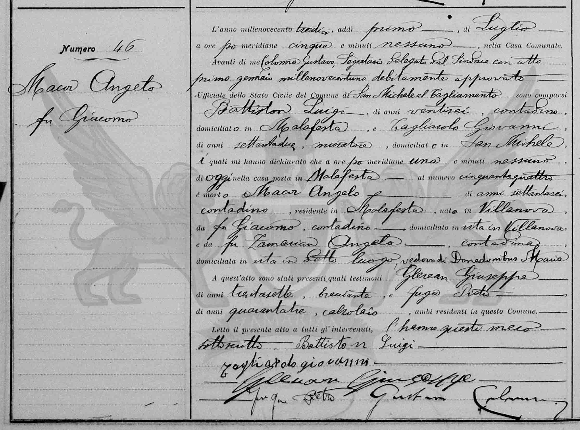 Diante de mim Colonna Gustavo, Secretário delegado pelo Síndico com ato primeiro de janeiro de mil novecentos e um devidamente aprovado Oficial do Estado Civil do Município de San Michele al Tagliamento, compareceram Battiston Luigi, de vinte e seis anos, camponês, domiciliado em Malafesta, e Tagliarolo Giovanni, de setenta e dois anos, construtor, domiciliado em San Michele, os quais me declararam que às pós meridiana uma hora, de hoje, na casa situada em Malafesta, ao número cinquenta e quatro, faleceu Macor Angelo, de setenta e seis anos, camponês, residente em Malafesta, nascido em Villanova, (filho) do falecido Giacomo, camponês, domiciliado em vida em Villanova, e da falecida Zamarian Angela, camponesa, domiciliada em vida no referido local, viúvo de Donadonbus Maria.