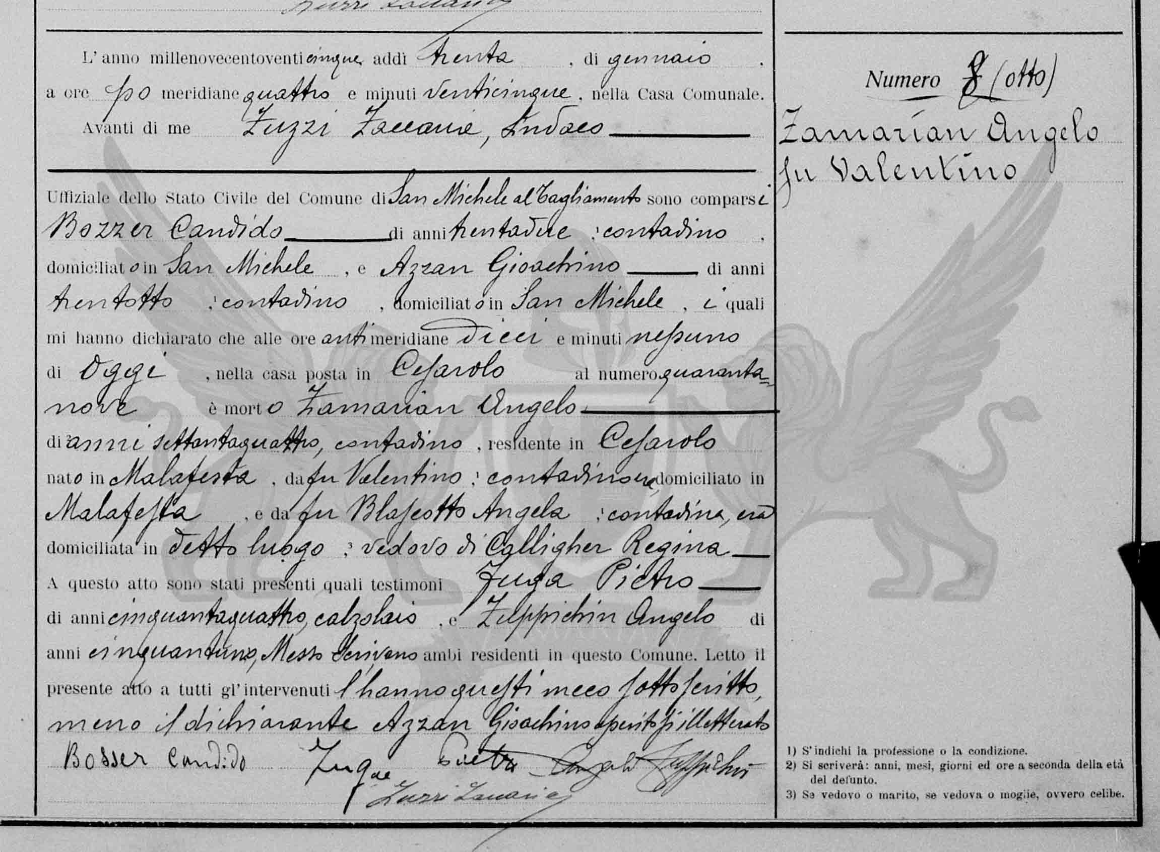 Diante de mim Zuzzi Zaccaria, Síndico Oficial do Estado Civil do Município de San Michele al Tagliamento, compareceram Bozzer Candido, de trinta e dois anos, camponês, domiciliado em San Michele, e Azzan Gioacchino, de trinta e oito anos, camponês, domiciliado em San Michele, os quais me declararam que às antimeridiana dez horas e trinta minutos, de hoje, na casa situada em Cesarolo, ao número quarenta e nove, faleceu Zamarian Angelo de setenta e quatro anos, camponês, residente em Cesarolo, nascido Malafesta, (filho) do falecido Valentino, camponês domiciliado em vida em Malafesta, e da falecida Blaseotto Angela, camponesa, domiciliada em vida no referido local, viúvo de Calligher Regina.
