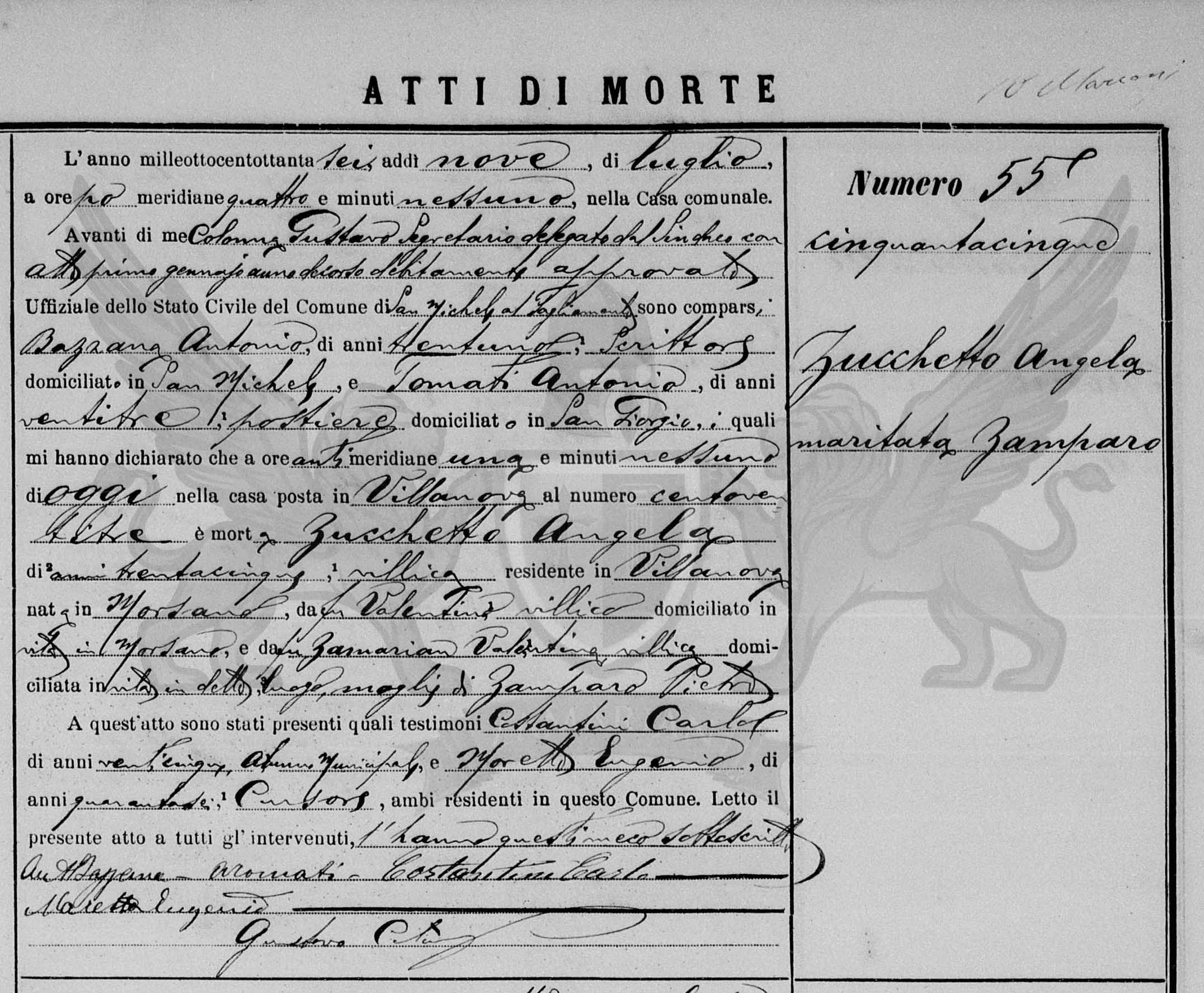 Diante de mim Colonna Gustavo Secretário delegado pelo Síndico com ato primeiro de janeiro do ano passado devidamente aprovado Oficial do Registro Civil do Município de San Michele al Tagliamento, compareceram Bazzana Antonio, de vinte e oito anos, escrevente, domiciliado em San Michele, e Tonati Antonio, de vinte e três anos, carteiro, domiciliado em San Giorgio, os quais me declararam que às ante meridiana uma hora, de hoje, na casa situada em Villanova ao número cento e vinte e três, faleceu Zucchetto Angela, de trinta e cinco anos, camponesa, residente em Villanova, nascida em Morsano, (filha) do falecido Valentino, camponês, domiciliado em vida e no referido local e da falecida Zamarian Valentina, camponesa, domiciliada em vida no referido local, esposa de Zamparo Pietro.