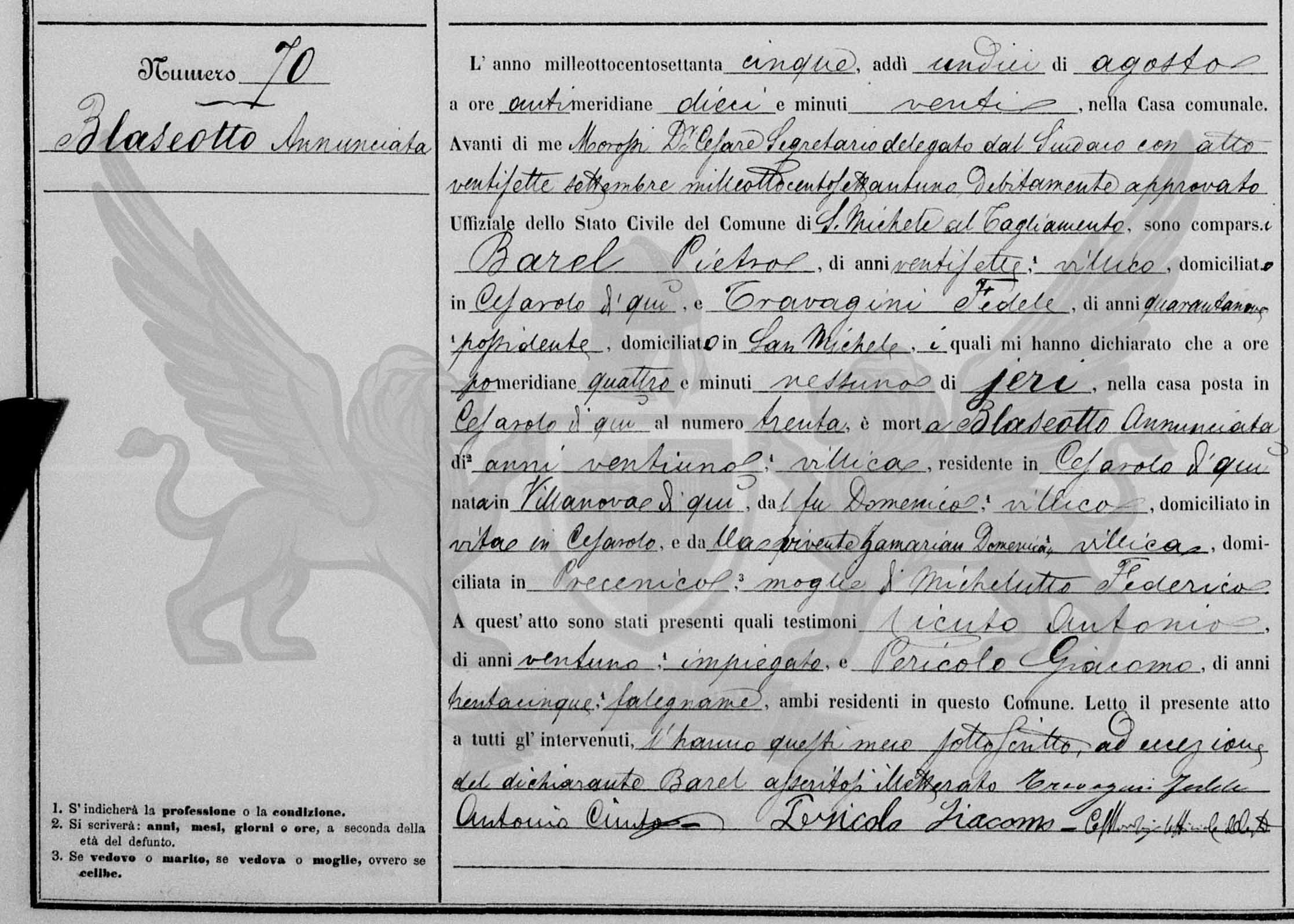 Diante de mim Morossi De Cesare, secretário delegado do Síndico com ato vinte e sete de setembro de mil oitocentos e oitenta e um devidamente aprovado Oficial do Estado Civil do Município de San Michele al Tagliamento, compareceram Barel Pietro, de vinte e sete anos, camponês domiciliado em Cesarolo daqui, e Travagini Fedele de quarenta e nove anos anos, proprietário de terras, domiciliado em San Michele, os quais me declararam que às pós meridiana quatro horas de ontem, na casa situada em Cesarolo daqui ao número trinta, faleceu Blaseotto Annunciata de vinte e um anos, camponesa residente em Cesarolo daqui, nascida em Villanova, (filha) do falecido Domenico, camponês, domiciliado em vida em Cesarolo daqui, e da vivente Zamarian Domenica, camponesa, domiciliada em Precenicco, mulher de Michelutto Federico.