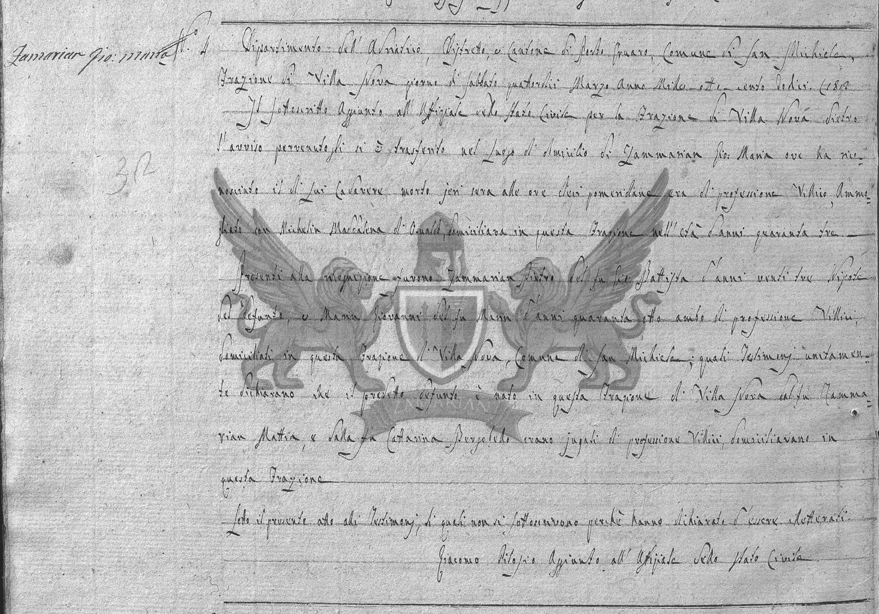 Presentes ao reconhecimento estavam Zammarian Pietro, filho do finado Gio: Battista de vinte e três anos, sobrinho do falecido e Maria Giovanni filho do finado Maria de quarenta e oito anos, ambos de profissão camponês domiciliados nesta Fração de Villanova, Município de San Michele quais testemunhas em conjunto declararam que o citado defunto era nascido nesta Fração de Villa Nova filho do finado Zammarian Mattia e da finada Cattarina Bergobello eram da mesma forma camponeses, domiciliavam nesta Fração.