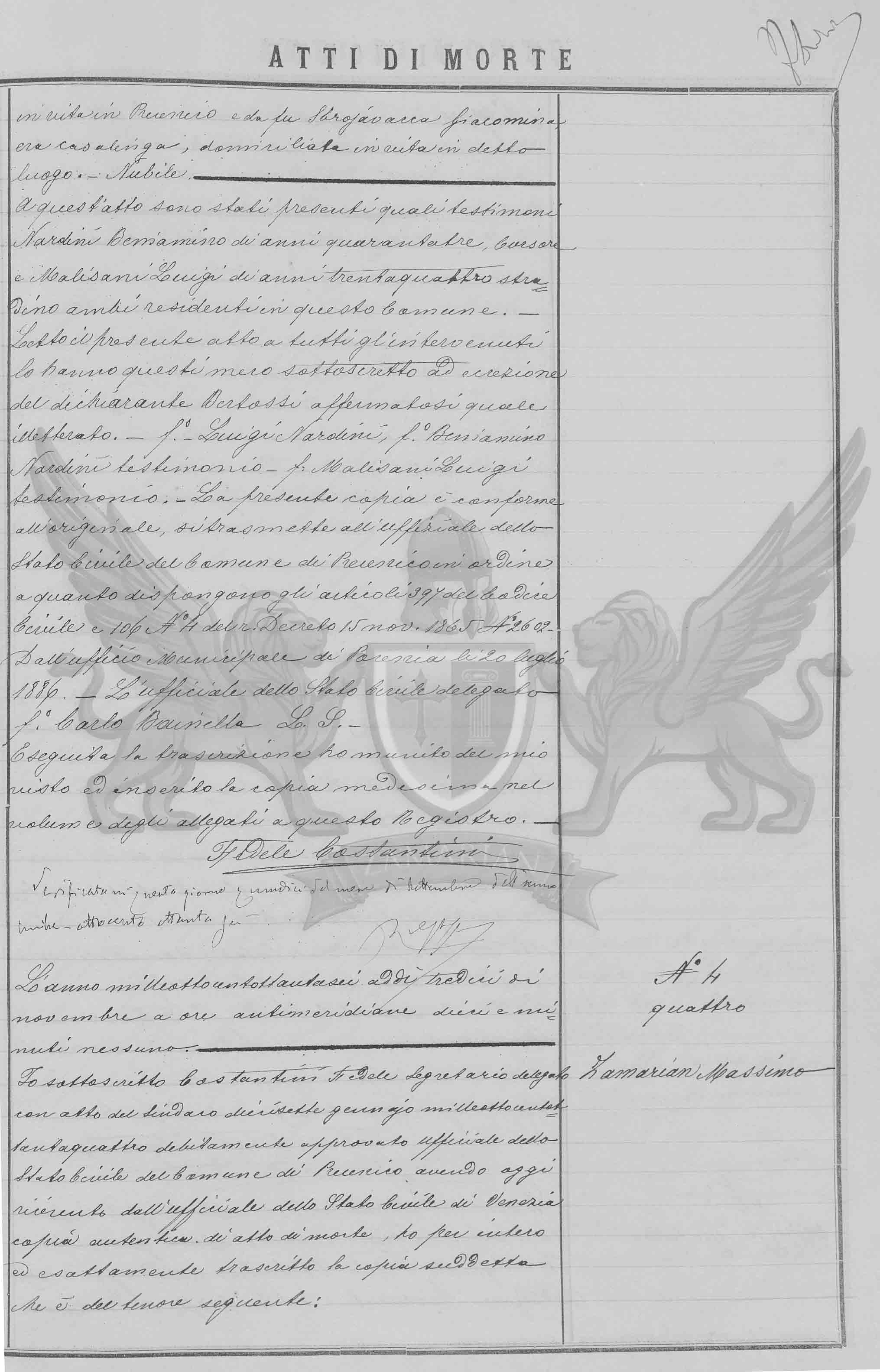 Ano de mil oitocentos e oitenta a seis aos oito dias de novembro ao meio dia e quarenta na casa municipal. Eu Ferdinando Fauton conservador por delegação quinze de setembro do ano passado devidamente aprovado, oficial do registro civil do Município de Venezia havendo recebido do Diretor do Manicômio masculino em San Servolo através de um aviso na data de hoje relativo a morte da qual em apresso e que munido do meu visto, insiro no volume dos anexos a este Registro, informa que às cinco horas da manhã de ontem na casa situada na ilha de San Servolo falecido Zamarian Massimo de vinte anos camponês residente em Precenicco, nascido no referido local, filho de Giacomo e de Giudici Laura, domiciliados em Precenicco, solteiro, ignorar a profissão dos genitores do falecido.