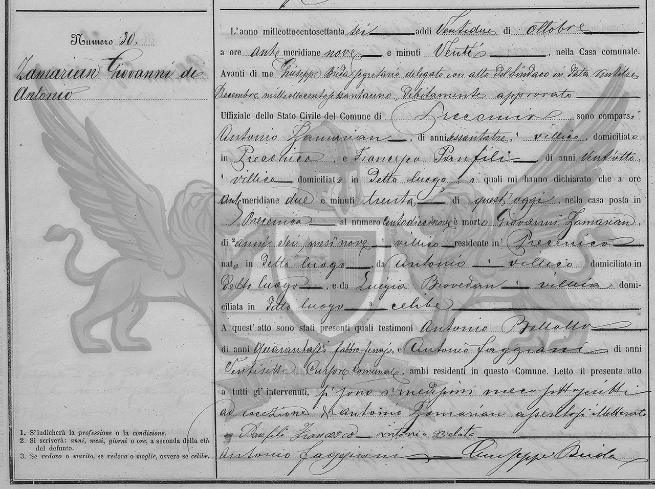 Diante de mim Giuseppe Brida, secretário delegado com ato do Síndico em data vinte e três de dezembro de mil oitocentos e setenta e um, devidamente aprovado Oficial do Registro Civil do Município de Precenicco, compareceram Antonio Zamarian, de sessenta e três anos, camponês, domiciliado em Precenicco, e Francesco Panfili, de vinte e oito anos, camponês, domiciliado no referido local, os quais me declararam que às duas horas e trinta minutos da manhã, de hoje, na casa situada em Precenicco, ao número cento e dezenove, faleceu Giovanni Zamarian, de seis anos e nove meses, camponês, residente em Precenicco, nascido no citado local, filho de Antonio, camponês, domiciliado no referido local, e de Luigia Brovedan, camponesa, domiciliada no referido local, solteiro.