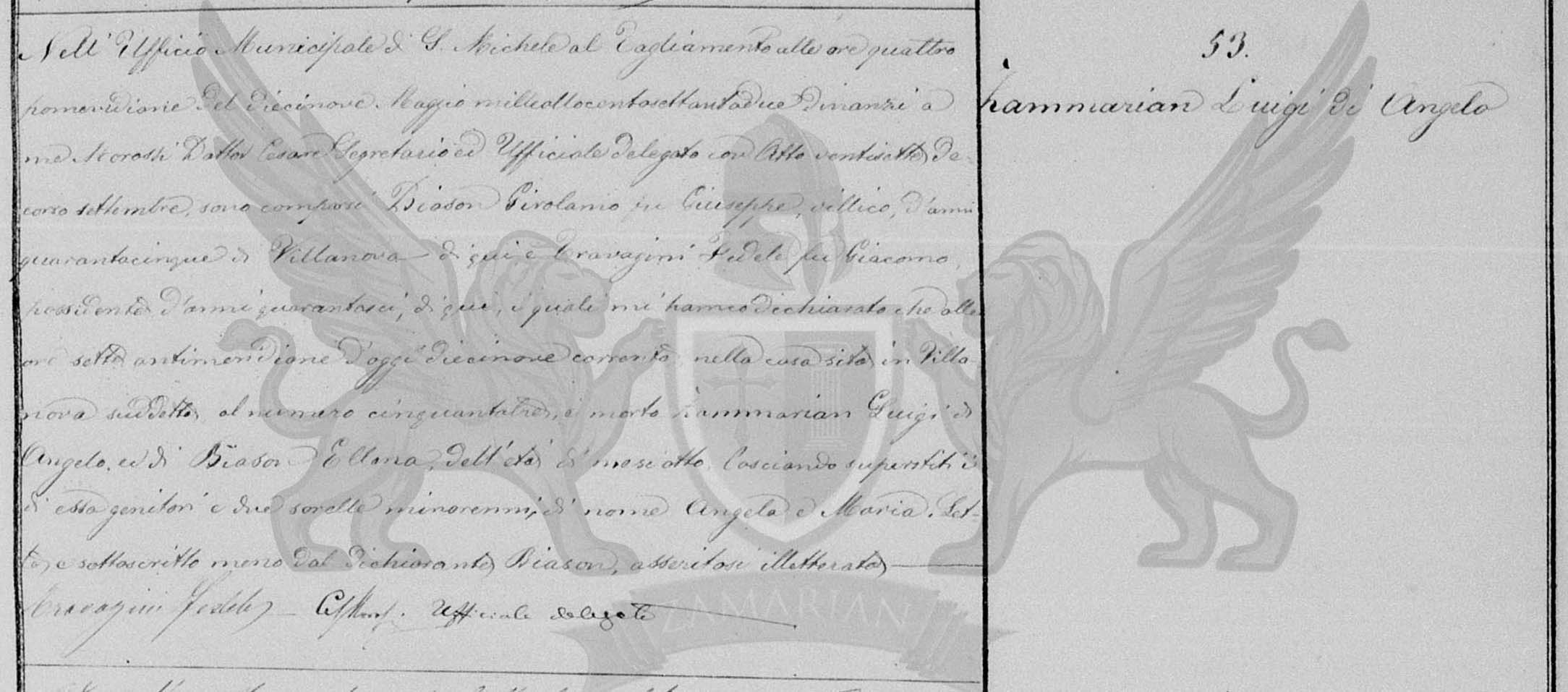 No Ofício Municipal de San Michele al Tagliamento às quatro horas pós meridiana do dia dezenove de maio de mil oitocentos e setenta e dois, diante de mim Marcosi Doutor Cesare Secretário e oficial Delegado com ato vinte e sete de setembro do ano decorrido, compareceram Biason Girolamo filho do falecido Giuseppe, camponês, do quarenta e cinco anos de Villanova daqui, e Travagini Padele, filho do falecido Giacomo, proprietário, de quarenta e seis anos, daqui, os quais declaram que às anti meridiana sete horas de hoje dezenove corrente, na casa situada em Villanova daqui supra citada ao número cinquenta e três, faleceu Zammarian Luigi filho de Angelo e de Biason Elena, da idade de oito meses, deixando os sobreviventes e dessa pais e duas irmãs menores, de nome Angela e Maria. Lido e subscrito menos pelo declarante Biason, afirmando-se iletrado.