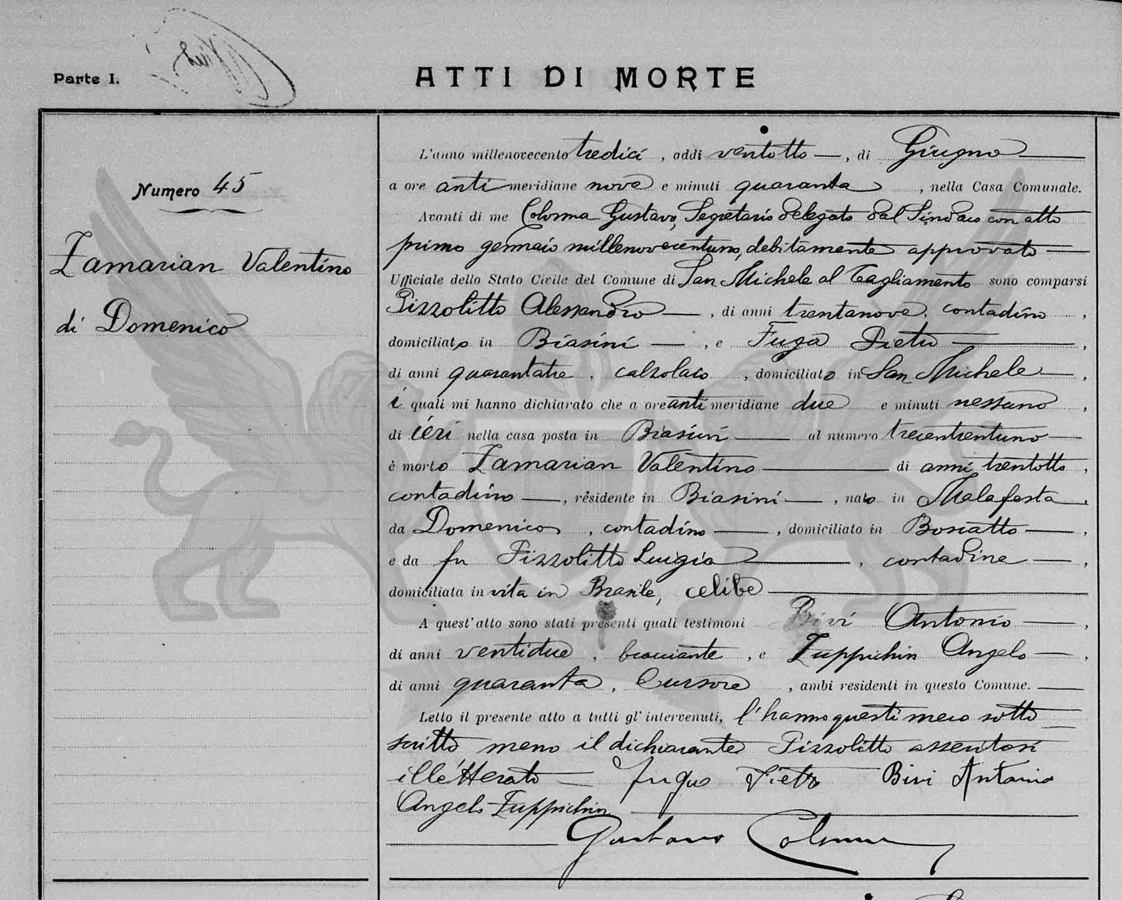Diante de mim Colonna Gustavo, Secretário delegado pelo Síndico com ato primeiro de janeiro mil novecentos e um Oficial do Estado Civil do Município de San Michele al Tagliamento, compareceram Pizzolitto Alessandro, de trinta e nove anos, camponês, domiciliado em Biasini, e Fuga Pietro, de quarenta e três anos, sapateiro, domiciliado em San Michele, os quais me declararam que às ante meridiana duas horas, de ontem, na casa situada em Biasini, ao número trezentos e trinta e um, faleceu Zamarian Valentino, de trinta e oito anos, camponês, residente em Biasini, nascido em Malafesta, (filho) de Domenico, camponês, domiciliado em Boscatto, e da falecida Pizzolitto Luigia, camponesa, domiciliada em vida no Brasil, solteiro.