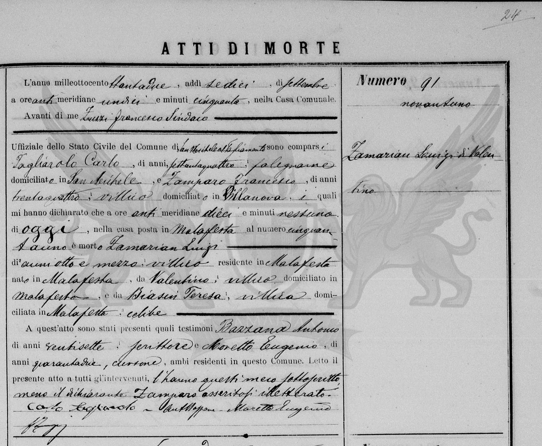 Diante de mim Zuzzi Francesco Síndico Oficial do Registro Civil do Município de San Michele al Tagliamento, compareceram Zamarian Giovanni Maria, de cinquenta e seis anos, camponês, domiciliado em Bevazzana, e Bazzana Antonio, de vinte e sete anos, escrevente, domiciliado in San Michele, os quais me declararam que às pós meridiana uma hora, de ontem, na casa situada em Bevazzana ao número oitenta e quatro, faleceu Zamarian Angelo, de seis dias, camponês, residente em Bevazzana, nascido no referido local, (filho) de Felice, camponês, domiciliado em Bevazzana e da falecida Ellero dita Sassaron Albina, camponesa, domiciliada em em vida no referido local, solteiro.