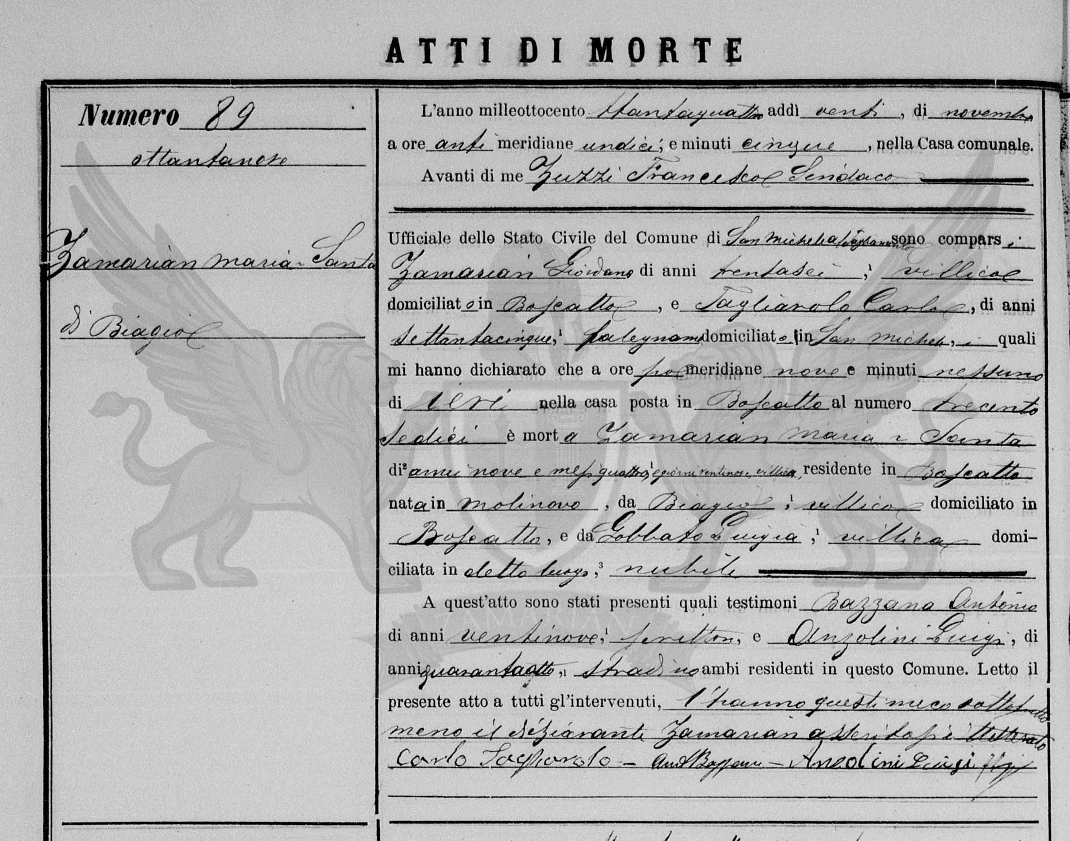 Diante de mim Zuzzi Francesco Síndico Oficial do Registro Civil do Município de San Michele al Tagliamento, compareceram Zamarian Giordano, de trinta e seis anos, camponês, domiciliado em Boscatto, e Tagliarolo Carlo, de setenta e cinco anos, marceneiro, domiciliado in San Michele, os quais me declararam que às pós meridiana nove horas, de ontem, na casa situada em Boscatto ao número trezentos e dezesseis, faleceu Zamarian Maria Santa, de nove anos quatro meses e vinte e nove dias, camponesa, residente em Boscatto, nascida em Molinovo, (filha) de Biagio, camponês, domiciliado em Boscatto e de Gobbato Luigia, camponesa, domiciliada em Boscatto, solteira.