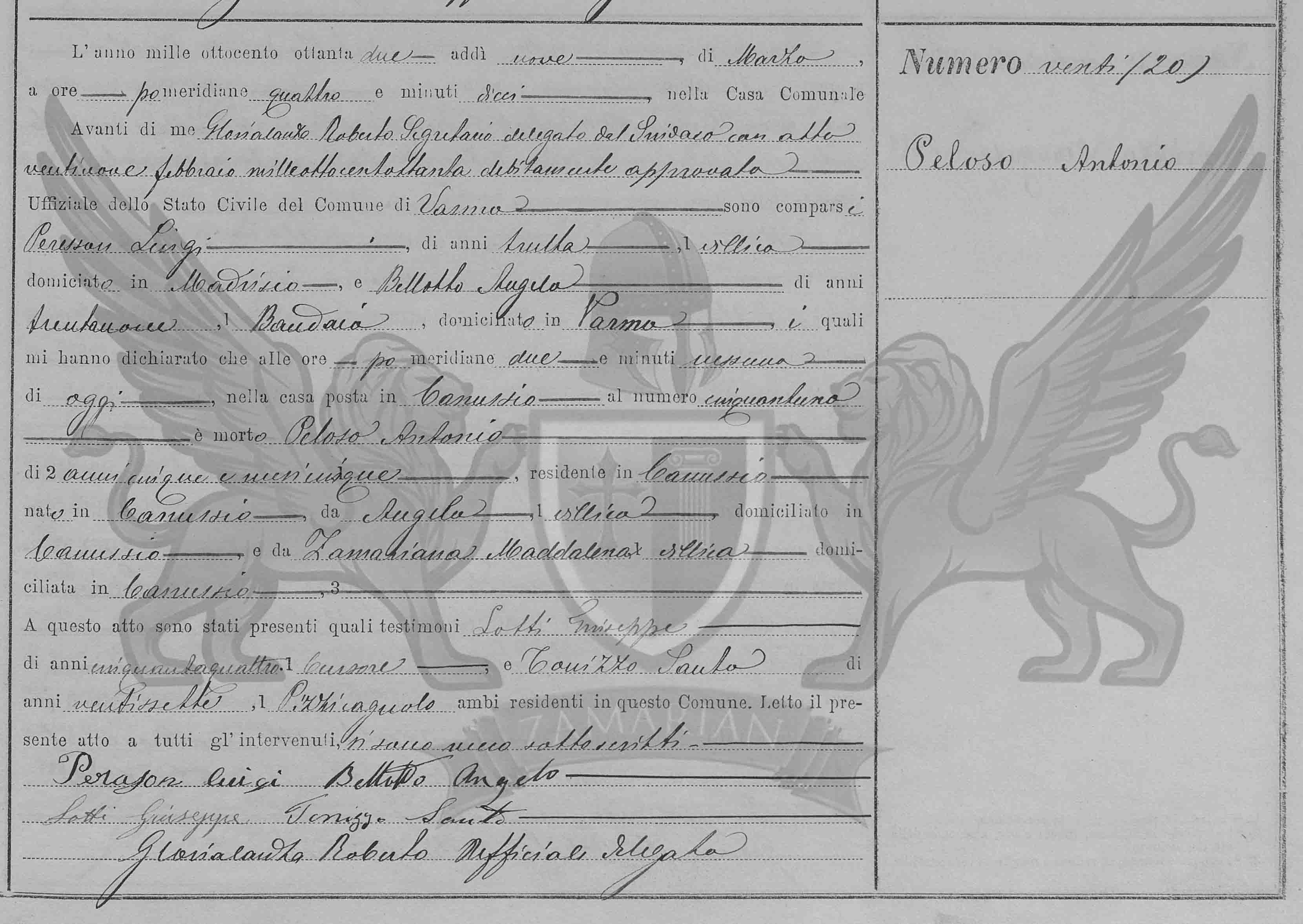 Diante de mim Glorialanza Roberto secretário delegado pelo Síndico com ato vinte e nove de fevereiro de mil oitocentos e oitenta devidamente aprovado Oficial do Registro Civil do Município de Varmo, compareceram Peressan Luigi, de trinta anos, camponês, domiciliado em Madrisio, e Bellotto Angelo, de trinta e nove anos, domiciliado em Varmo, os quais me declararam que as pós meridiana duaso horas, de hoje na casa situada em Canussio ao número cinquenta e um, faleceu Peloso Antonio de cinco anos e cinco meses, residente em Canussio nascido em Canussio, (filho) de Angelo, camponês, domiciliado em Canussio, e de Zamariana Maddalena, camponesa, domiciliada em Canussio, -.
