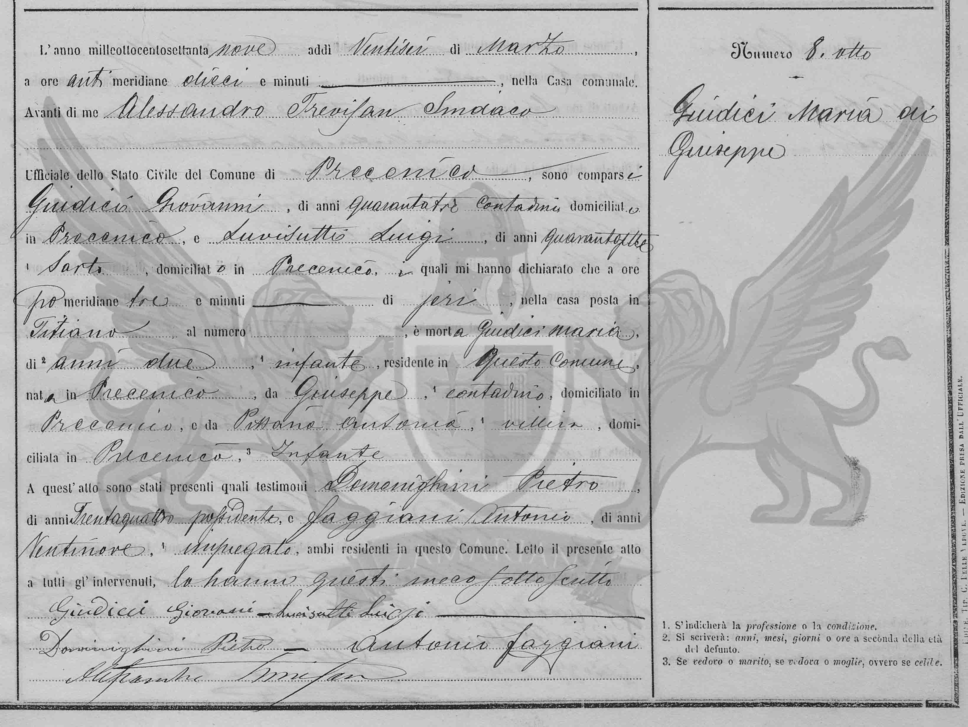 Diante de mim Alessandro Trevisan Síndico Oficial do Registro Civil do Município de Precenicco, compareceram Giudici Giovanni, de quarenta e três anos, camponês, domiciliado neste município, e Luvisutto Luigi, de quarenta e sete anos, artesão, domiciliado em Precenicco, os quais me declararam que às pós-meridiana três horas, de ontem, na casa situada em Titiano, ao número —, faleceu Giudici Maria, de dois anos, infante, residente neste Município, nascida em Precenicco, filha de Giuseppe, camponês, domiciliado em Precenicco, e de Pittana Antonia, camponesa, domiciliada em Precenicco, infante.
