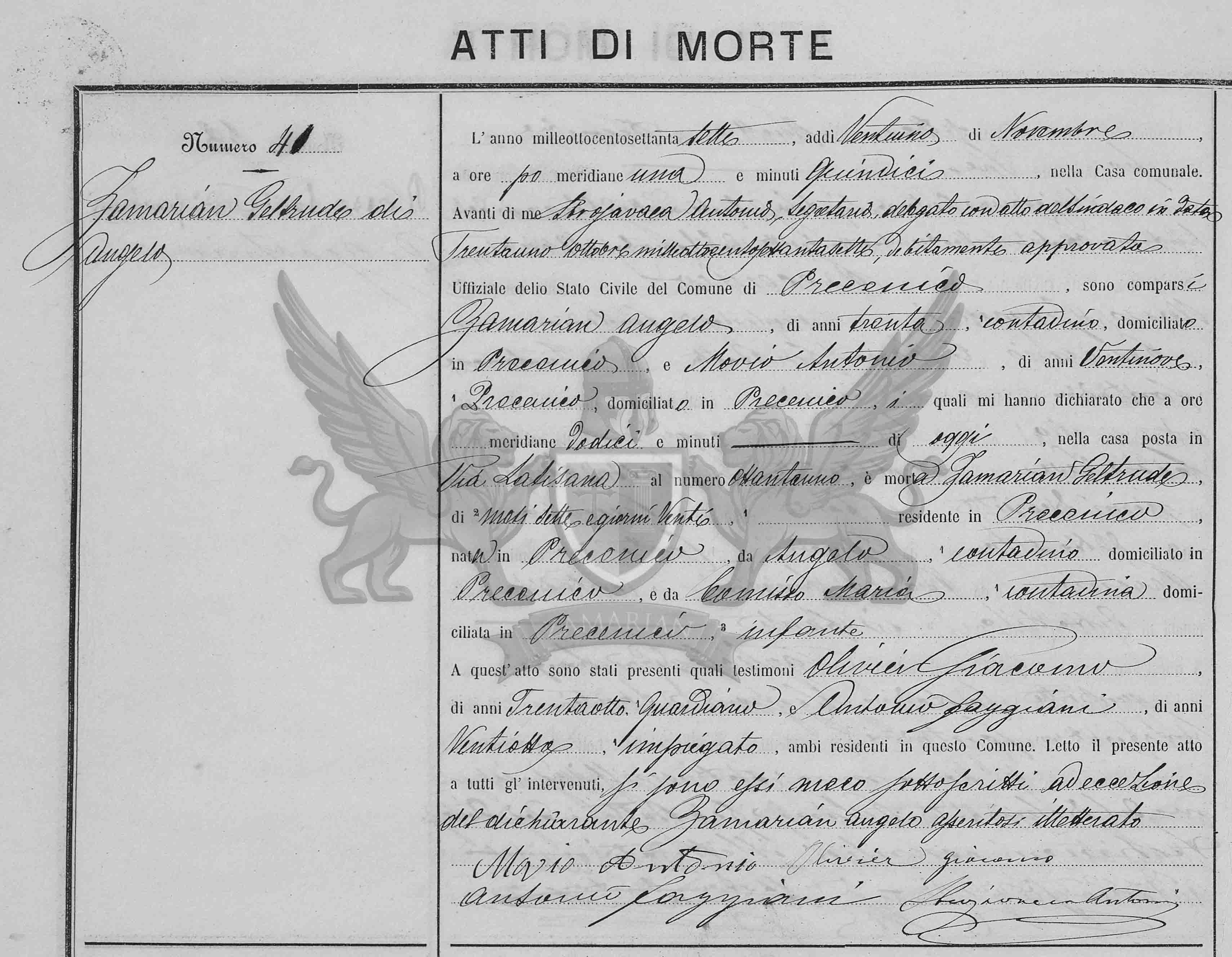Diante de mim Sbrajavacea Antonio secretário delegado com ato do Síndico em data trinta e um de outubro de mil oitocentos e setenta e sete, devidamente aprovado Oficial do Registro Civil do Município de Precenicco, compareceram Angelo Zamarian, de trinta anos, camponês, domiciliado em Precenicco, e Movio Antonio, de vinte e nove anos, domiciliado em Precenicco, os quais me declararam que ao meio dia, de hoje, na casa situada em Via Latisana, ao número oitenta e um, faleceu Zamarian Geltrude, de sete meses e vinte dias, residente em Precenicco, nascida Precenicco, filha de Angelo, camponês, domiciliado em Precenicco, e de Comisso Maria, camponesa, domiciliada no citado local, infante.