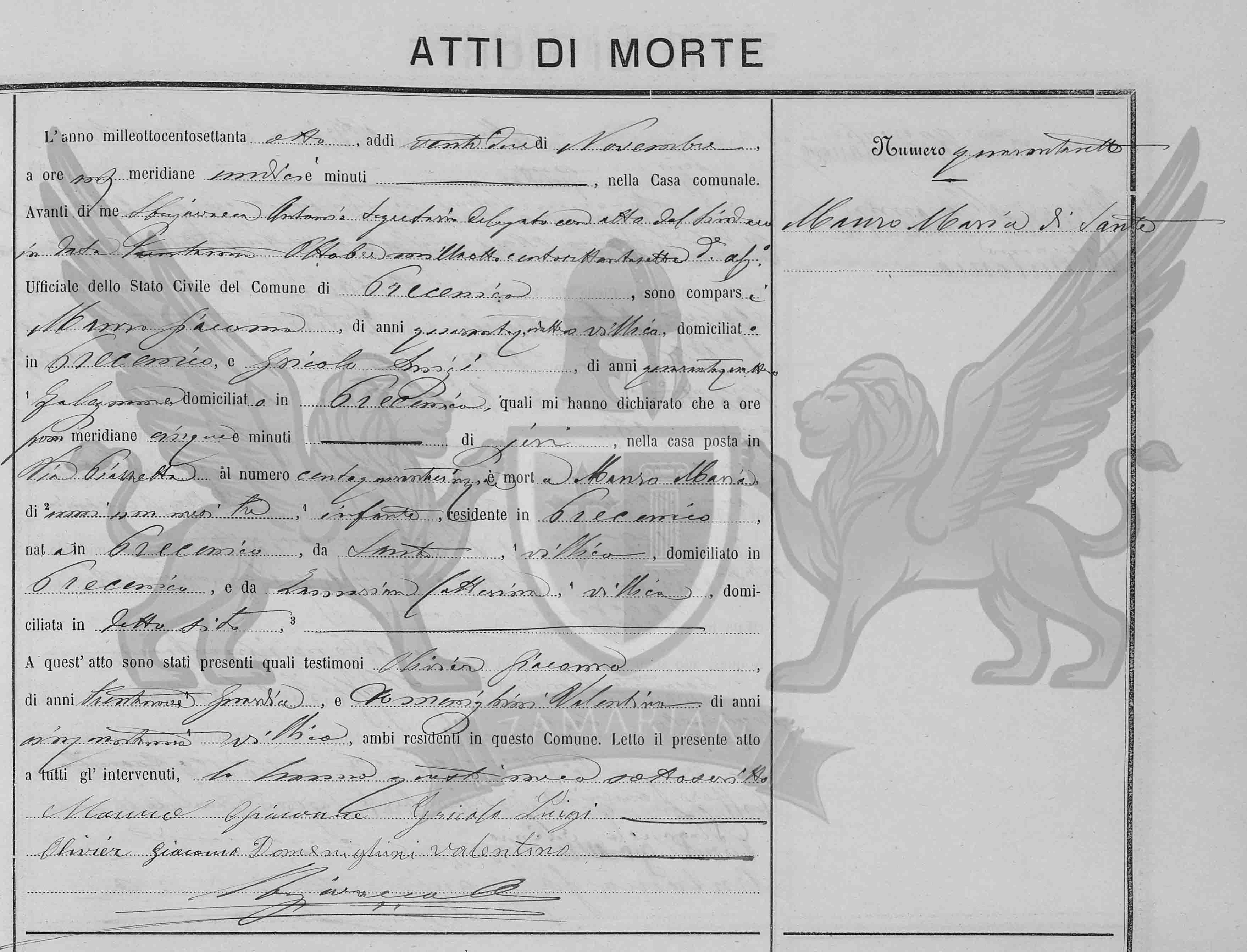 Diante de mim Sbrajavacea Antonio Secretário Delegado com ato do Síndico em data trinta e um de outubro de mil oitocentos e setenta e sete devidamente aprovado Oficial do Estado Civil do Município de Precenicco, compareceram Mauro Giacomo, de quarenta e quatro anos, camponês, domiciliado em Precenicco, e Gricolo Luigi, de quarenta e quatro anos, sapateiro, domiciliado em Precenicco, os quais me declararam que as cinco horas da tarde, de ontem na casa situada em Via Piazzetta ao número cento e quarenta e cinco, faleceu Mauro Maria de um ano e oito meses, infante, residente em Precenicco nascida em Precenicco, filha de Santo, camponês, domiciliado em Precenicco, e de Zamarian Catterina, camponesa, domiciliada no referido local.