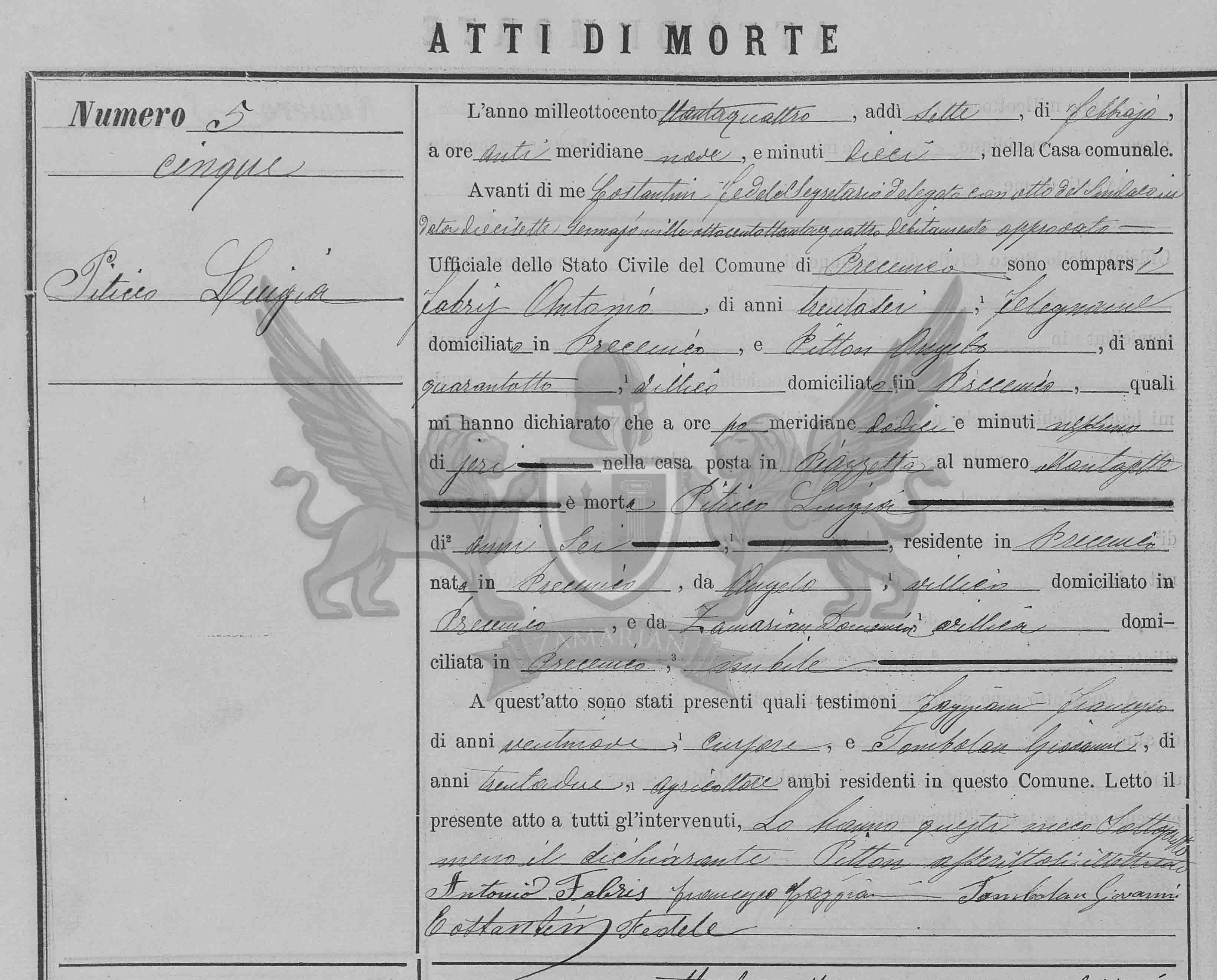 Diante de mim Costantini Fedele secretário delegado Oficial do Registro Civil do Município de Precenicco, compareceram Fabris Antonio, de trinta e seis anos, marceneiro, domiciliado em Precenicco, e Pitton Angelo, de quarenta e oito anos, camponês, domiciliado in Precenicco, os quais me declararam que às pós meridiana doze horas, de ontem, na casa situada em Piazzetta, ao número oitenta e sete, faleceu Piticco Luigia, de seis anos, -, residente em Precenicco, nascida em Precenicco, (filha) de Angelo, era camponês, domiciliado em Precenicco, e de Zamarian Domenica, camponesa, domiciliada Precenicco, infante.