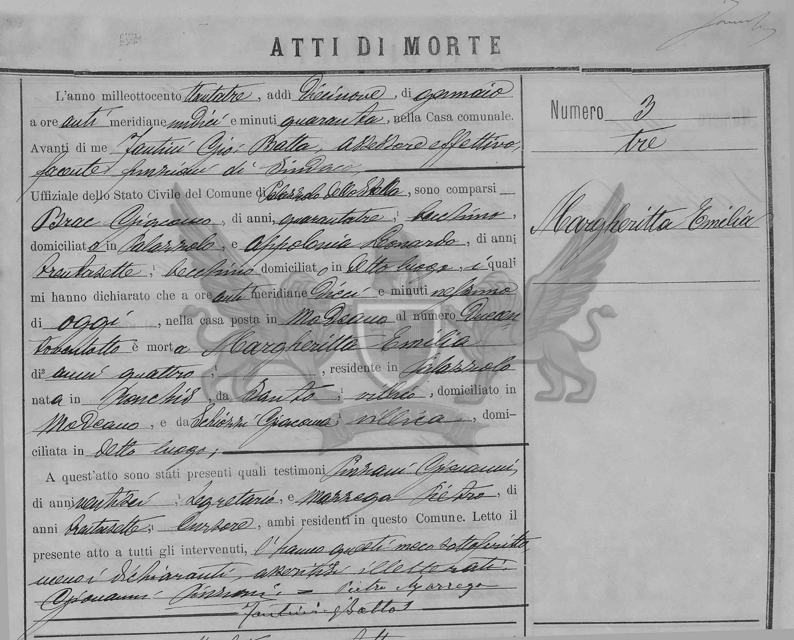Diante de mim Fantin Giovanni Battista assessor efetivo, fazendo funções de Síndico Oficial do Registro Civil do Município de Palazzolo dello Stella, compareceram Brac Giacomo, de quarenta e três anos, pedreiro, domiciliado em Palazzolo, e Appolonio Leonardo, de trinta e sete anos, pedreiro, domiciliado em dito local, os quais me declararam que às ante meridiana dez horas, de hoje, na casa situada em Modeano, ao número duzentos e oitenta e oito, faleceu Margheritta Emilia, de quatro anos, residente em Palazzolo, nascida em Ronchis, (filha) de Santo, lavrador, domiciliado em Modeano, e de Schiozzi Giacoma, lavradora, domiciliada em dito local.