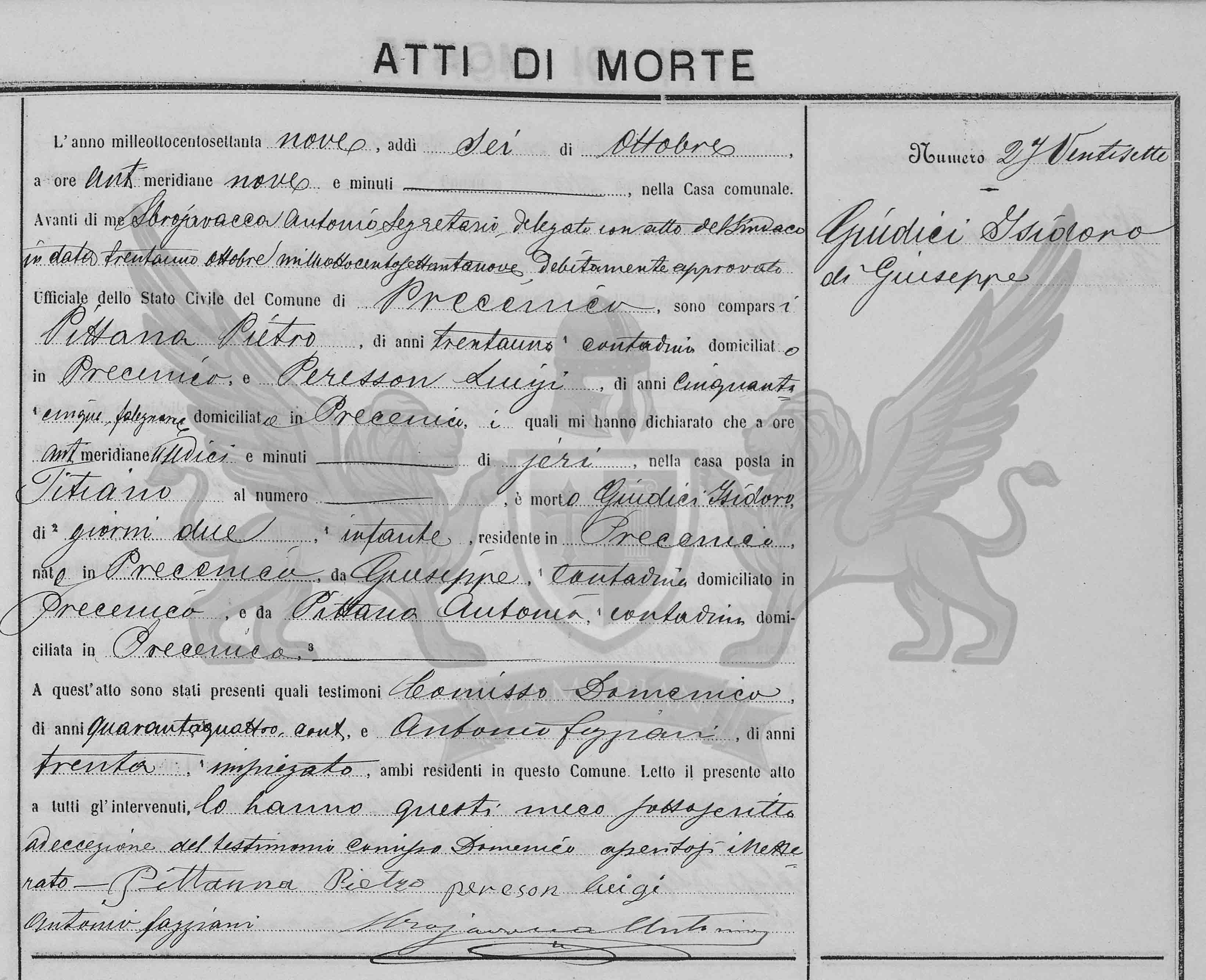 Diante de mim Sbrojavacea Antonio Secretário delegado com ato pelo Síndico em data de trinta e um de outubro de mil oitocentos e setenta e nove devidamente aprovado Oficial do Registro Civil do Município de Precenicco, compareceram Pietro Pittana, de trinta e um anos, camponês, domiciliado em Precenicco, e Peresson Luigi, de cinquenta e cinco anos, marceneiro, domiciliado em Precenicco, os quais me declararam que às anti-meridianonze horas, de ontem, na casa situada em Titiano, ao número —, faleceu Giudici Isidoro, de dois dias, infante, residente neste Precenicco, nascido em Precenicco, filho de Giuseppe, camponês, domiciliado em Precenicco, e de Pittana Antonia, camponesa, domiciliada em Precenicco.
