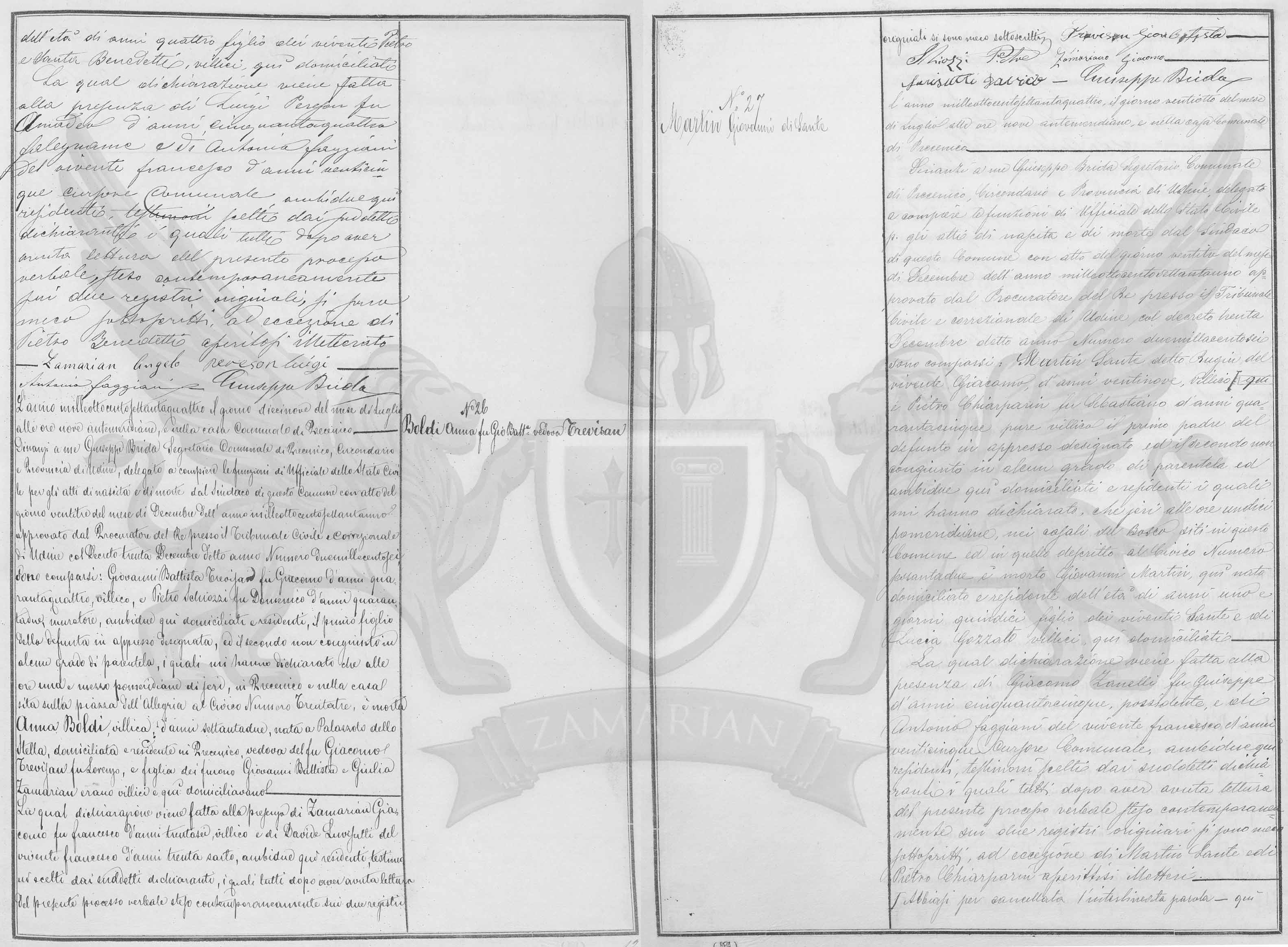 Diante de mim Giuseppe Brida Secretário do Município de Precenicco, Circundário e Província de Udine, delegado e a cumprir as funções de Oficial do Estado Civil pelos atos de nascimento e falecimento do Síndico deste Município com ato do dia vinte e três do mês de Dezembro do ano de mil oitocentos e setenta e um, aprovado pelo Procurador do Rei junto ao Tribunal Civil Correcional de Udine com Decreto dia trinta de Dezembro do citado ano número dois mil cento e seis, compareceram: Giovanni Battista Trevisan, filho do falecido Giacomo, de quarenta e dois anos, camponês e de Pietro Schiozzi filho do falecido Domenico, de quarenta e quatro anos, construtor ambos aqui domiciliados e residentes, o primeiro filho da falecida em apresso designada, e o segundo sem nenhum grau de parentesco, os quais me declararam que às treze horas e trinta minutos pós meridianas, de ontem, em Precenicco, na casa situada sobre a praça da Alegria ao Civico Número trinta e três, faleceu Anna Boldi, camponesa de setenta e dois anos de idade, nascida em Palazzolo dello Stella, domiciliada e residente em Precenicco, viúva do falecido Giacomo Trevisan filho do falecido Lorenzo, e filha dos falecidos Giovanni Battista e Giulia Zamarian eram camponeses e aqui domiciliavam.