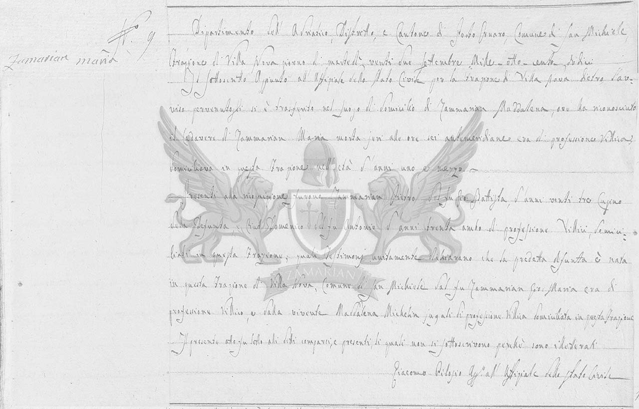 Presentes ao reconhecimento estavam Zammarian Pietro, filho do finado Gio: Battista de vinte e três anos primo da falecida, e Riet Domenico filho do finado Antonio de trinta anos ambos de profissão camponês, domiciliados nesta Fração de Villa Nova, quais testemunhas em conjunto declararam que o já citada falecida nasceu nesta Fração de Villa Nova, Município de San Michele filha dado finado Zammarian Gio: Maria era de profissão camponês e da vivente Maddalena Michelin igualmente de profissão camponesa, domiciliada nesta Fração.