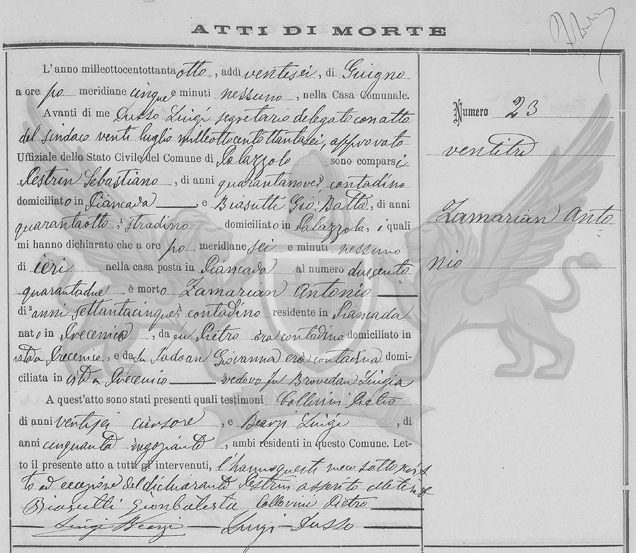Diante de mim Dusso Luigi, secretário delegado com ato do Síndico vinte de julho de mil oitocentos e oitenta e seis, aprovado Oficial do Registro Civil do Município de Palazzolo, compareceram Pestrin Sebastiano, de quarenta e nove anos, camponês, domiciliado em Piancada, e Biasutti Gio:Batta, de quarenta e oito anos, pavimentador domiciliado em Palazzolo, os quais me declararam que às seis horas da tarde, de ontem, na casa situada em Piancada, ao número duzentos e quarenta e dois, faleceu Zamarian Antonio, de setenta e cinco anos, camponês, residente em Piancada, nascido em Precenicco, filho do finado Pietro, era camponês, domiciliado em vida em Precenicco, e da finada Padovan Giovanna, era, camponesa, domiciliada em vida em Precenicco, viúvo de Brovedan Luigia.