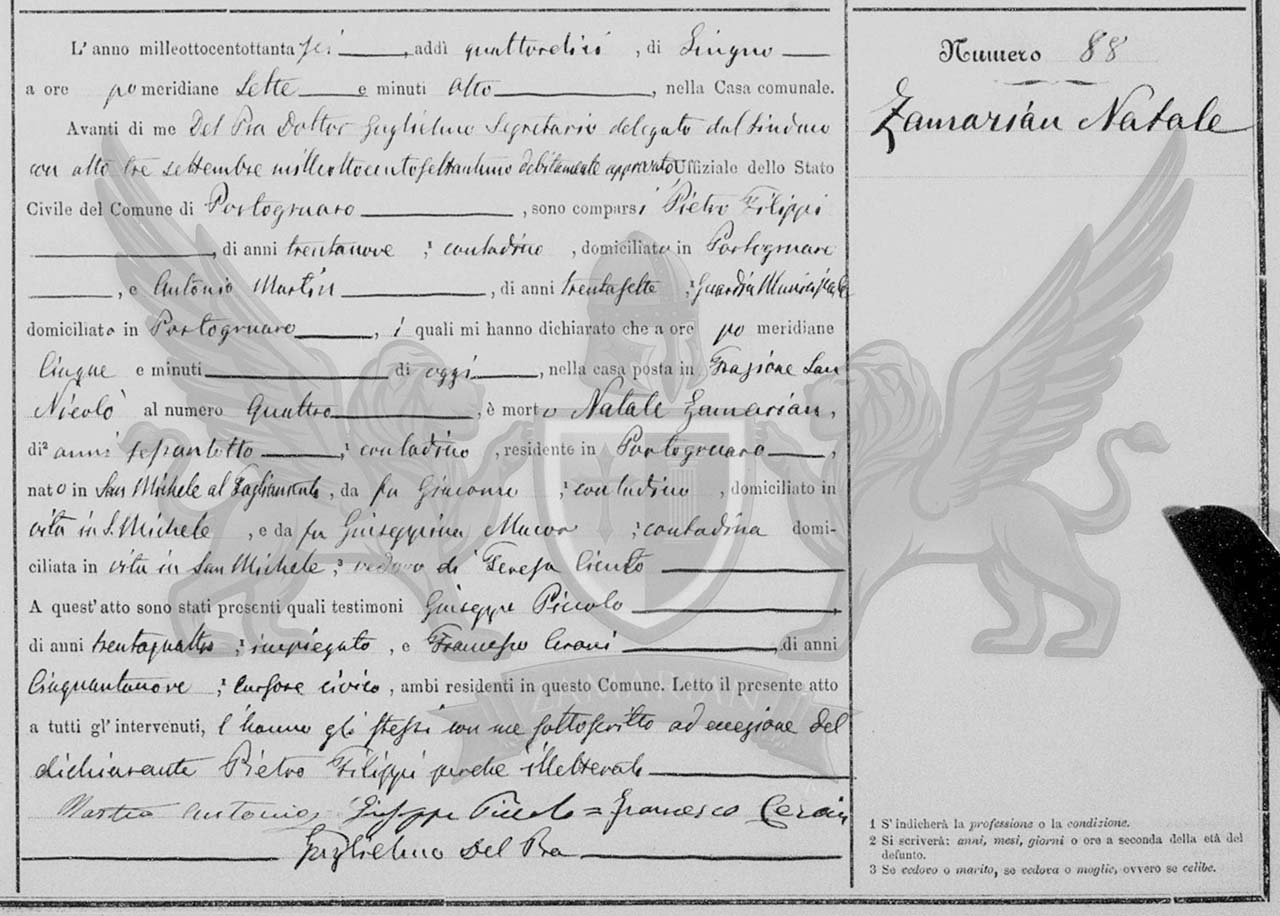 Diante de mim Del Pra Doutor Guglielmo secretário delegado do Síndico com ato três de setembro de mil oitocentos e setenta e um devidamente aprovado Oficial do Registro Civil do Município de Portogruaro, compareceram Pietro Filippi, de trinta e nove anos, camponês, domiciliado em Portogruaro, e Antonio Martin, de trinta e sete anos, Guarda Municipal domiciliado em Portogruaro, os quais me declararam que as cinco horas da tarde, de hoje na casa situada em Fração San Nicolò, no número quatro faleceu Natale Zamarian, de sessenta e oito anos, camponês, residente em Portogruaro nascido em San Michele al Tagliamento, filho de Giacomo, camponês, domiciliado em vida em San Michele, e da finada Giuseppina Macor, camponesa, domiciliada em vida em San Michele, viúvo de Teresa Cicuto.