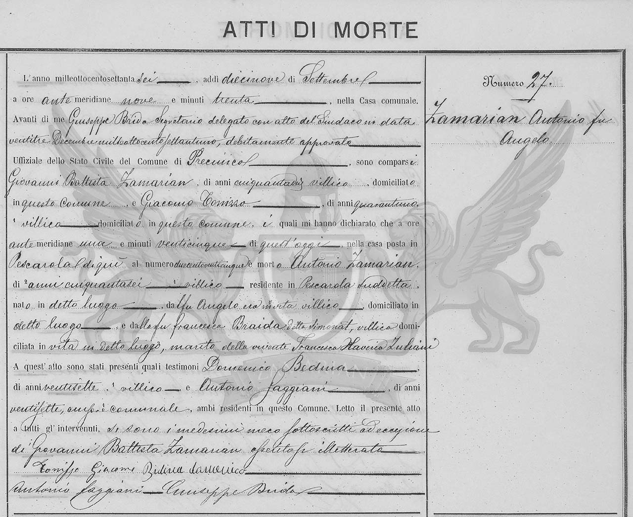 Diante de mim Giuseppe Briola, secretário delegado com ato do Síndico em data vinte e três de dezembro de mil oitocentos e setenta e um, devidamente aprovado Oficial do Registro Civil do Município de Precenicco, compareceram Giovanni Battista Zamarian, de cinquenta e dois anos, camponês, domiciliado neste Município, e Giacomo Tonizzo, de quarenta e um anos, camponês, domiciliado neste Município, os quais me declararam que às uma e vinte e cinco da manhã, de hoje, na casa situada em Pescarola daqui, ao número duzentos e vinte e cinco, faleceu Antonio Zamarian, de cinquenta e seis anos, camponês, residente em Pescarola referida, nascido em no referido local, filho do finado Angelo, era camponês, domiciliado no referido local, e da finada Francesca Braida conhecida Simonat, camponesa, domiciliada em vida no local referido, marido da vivente Francesca Saverio Zuliani.