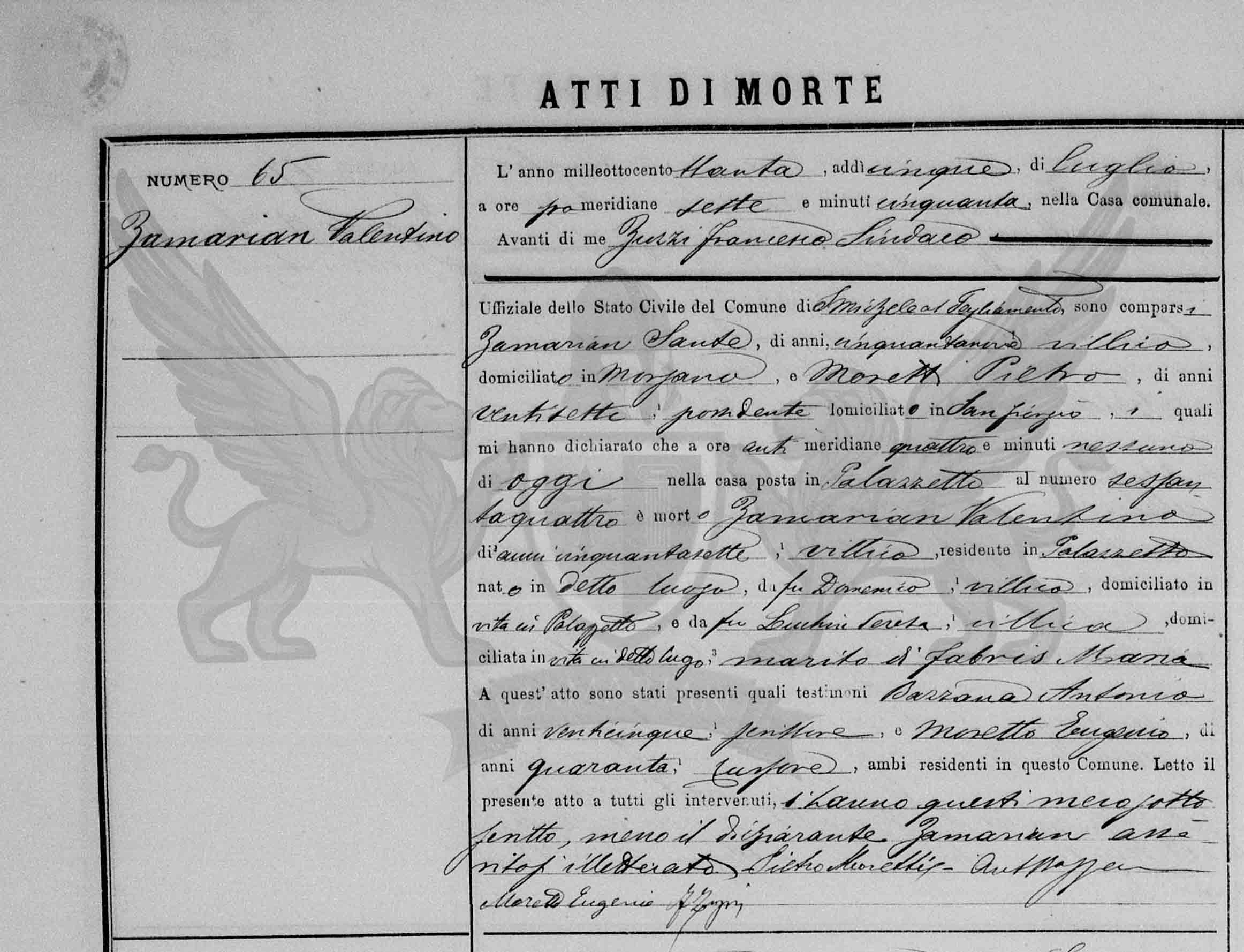 Diante de mim Zuzzi Francesco Síndico Oficial do Registro Civil do Município de San Michele al Tagliamento, compareceram Zamarian Sante, de cinquenta e nove anos, camponês, domiciliado em Morsano e Moretti Pietro, de vinte e sete anos, proprietário de terras, domiciliado in San Giorgio, os quais me declararam que às anti meridiana quatro horas, de ontem, na casa situada em Palazzetto, ao número sessenta e quatro, faleceu Zamarian Valentino, de cinquenta e sete anos, camponês, residente em Palazzetto, nascido no referido local, (filho) do falecido Domenico, camponês, domiciliado em vida em Palazzetto, e da falecida Lucchin Teresa, camponesa, domiciliada em vida no referido local, marido de Fabris Maria.