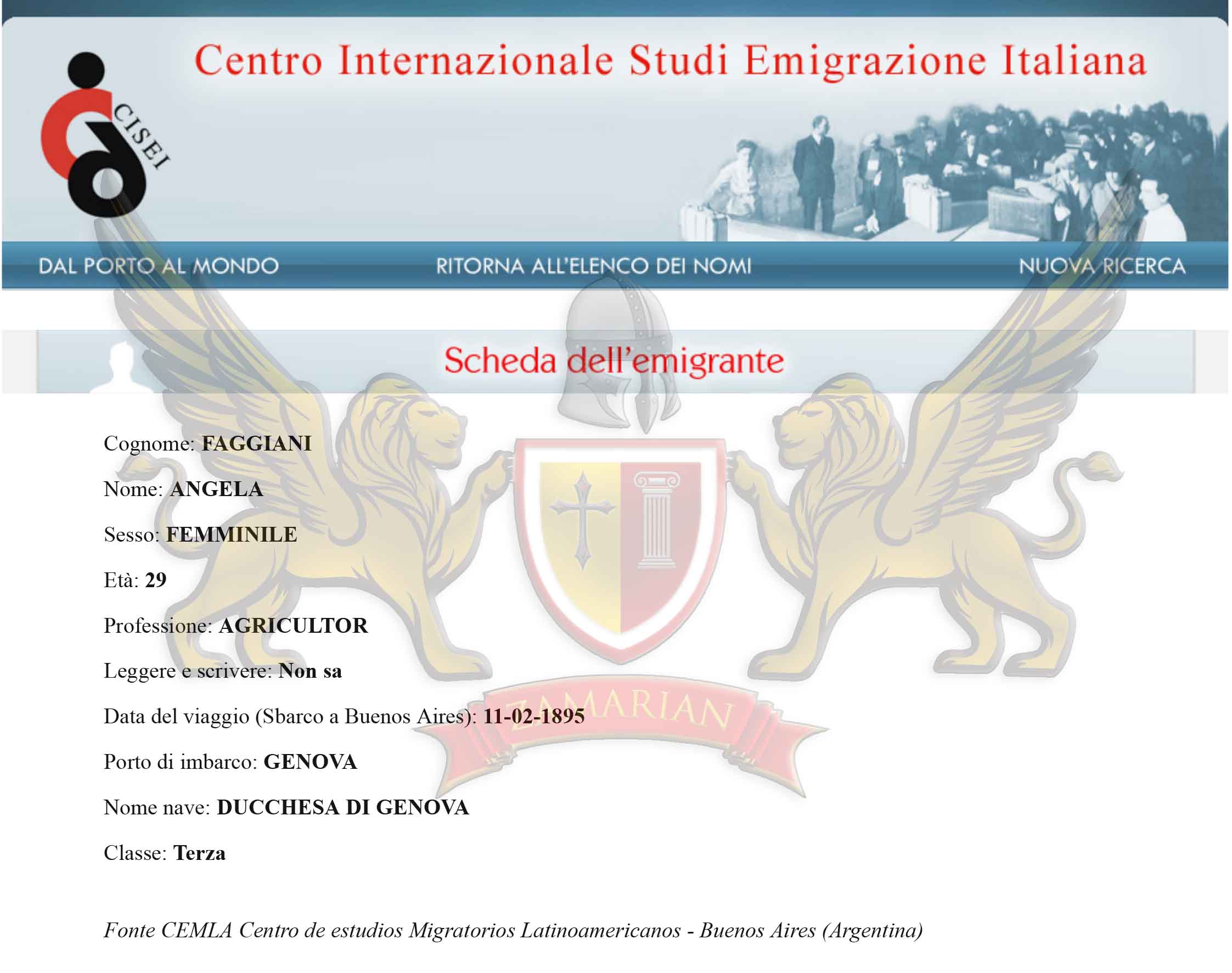 Registro emigratório de Angela Faggiani e família para Buenos Aires