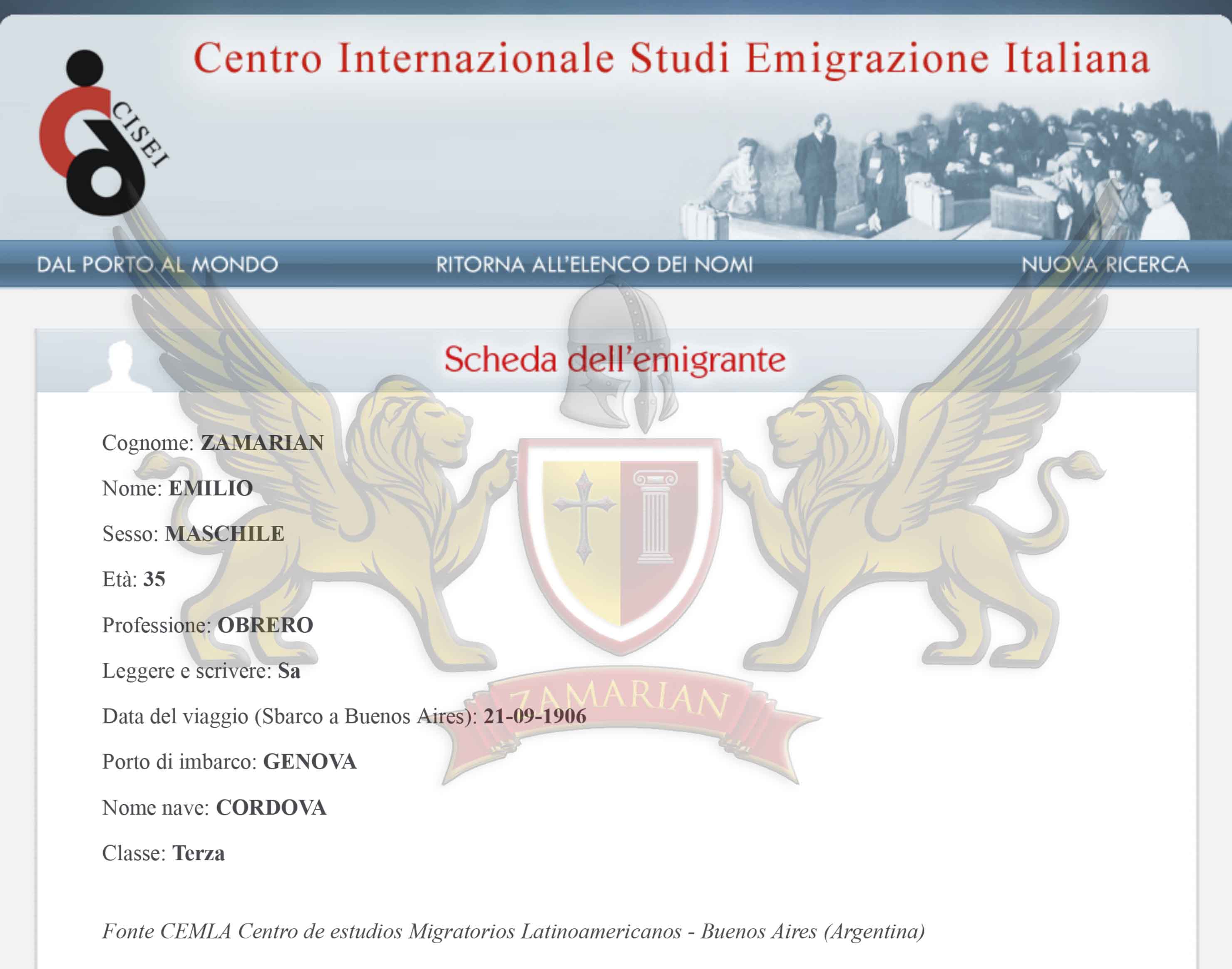 Registro de emigração em Buenos Aires de Emilio Zamarian