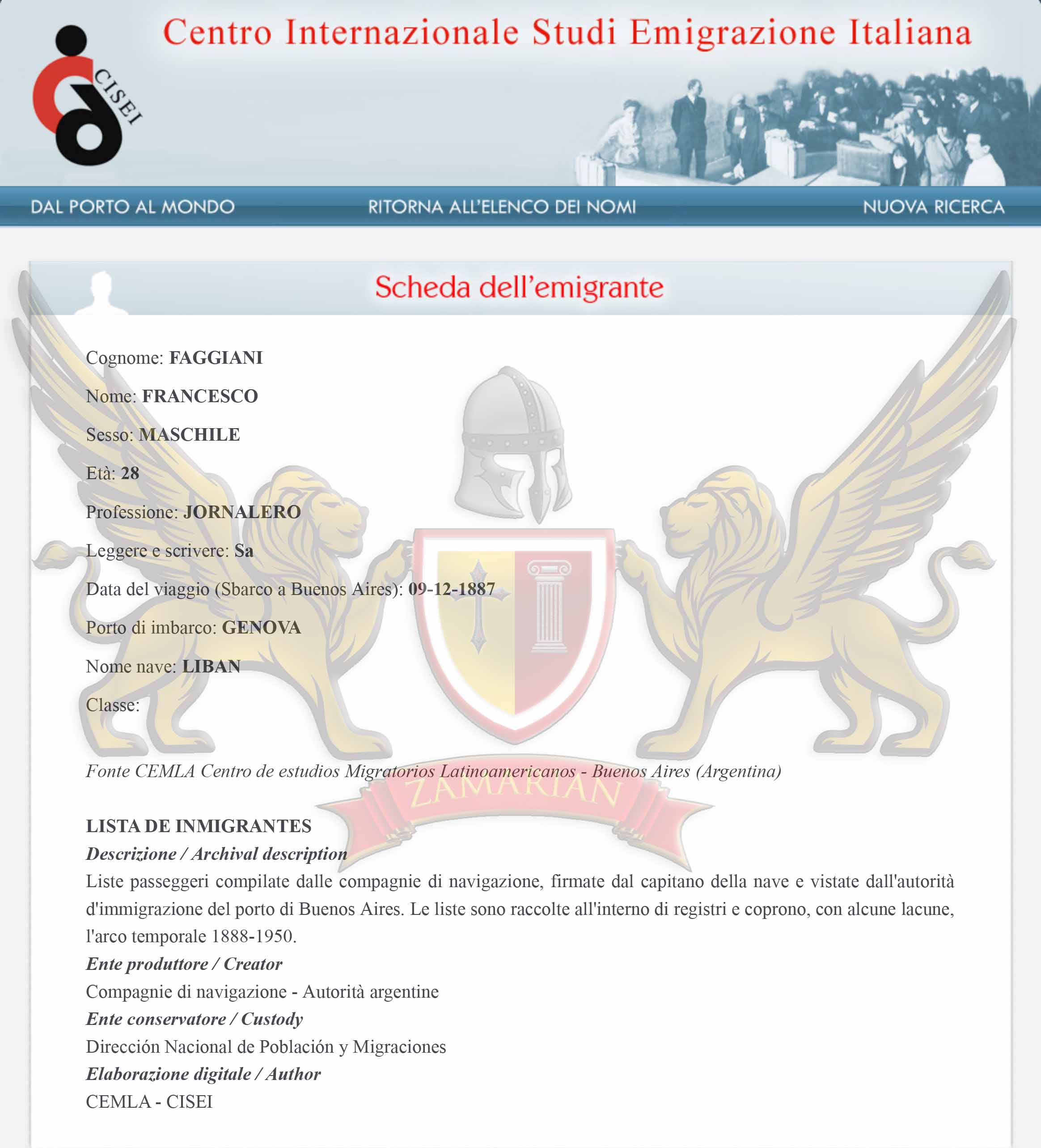 Registro de chegada à Buenos Aires de Francesco Faggiani