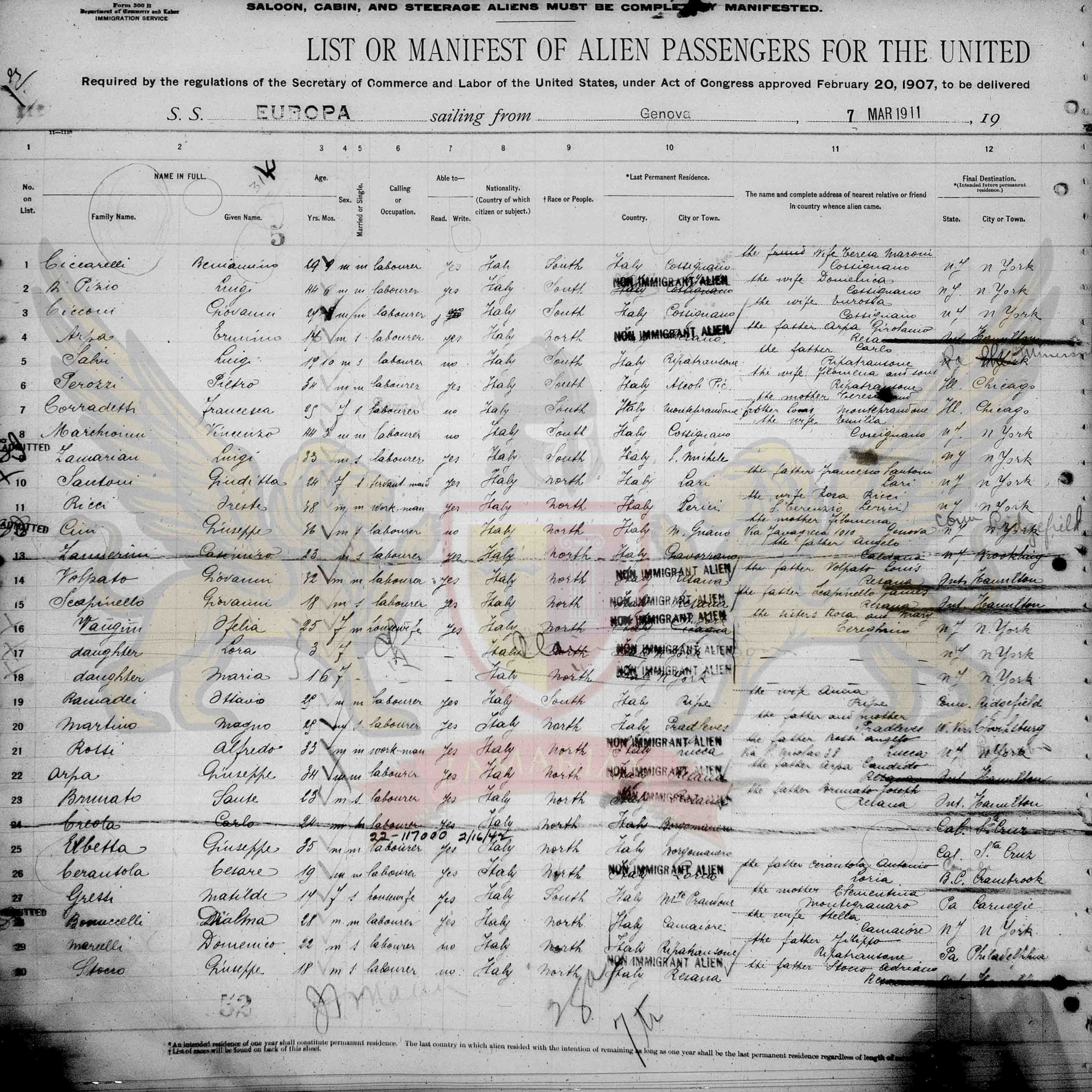 Registro de Imigração de Luigi Zamarian em Nova Iorque, Estados Unidos da América