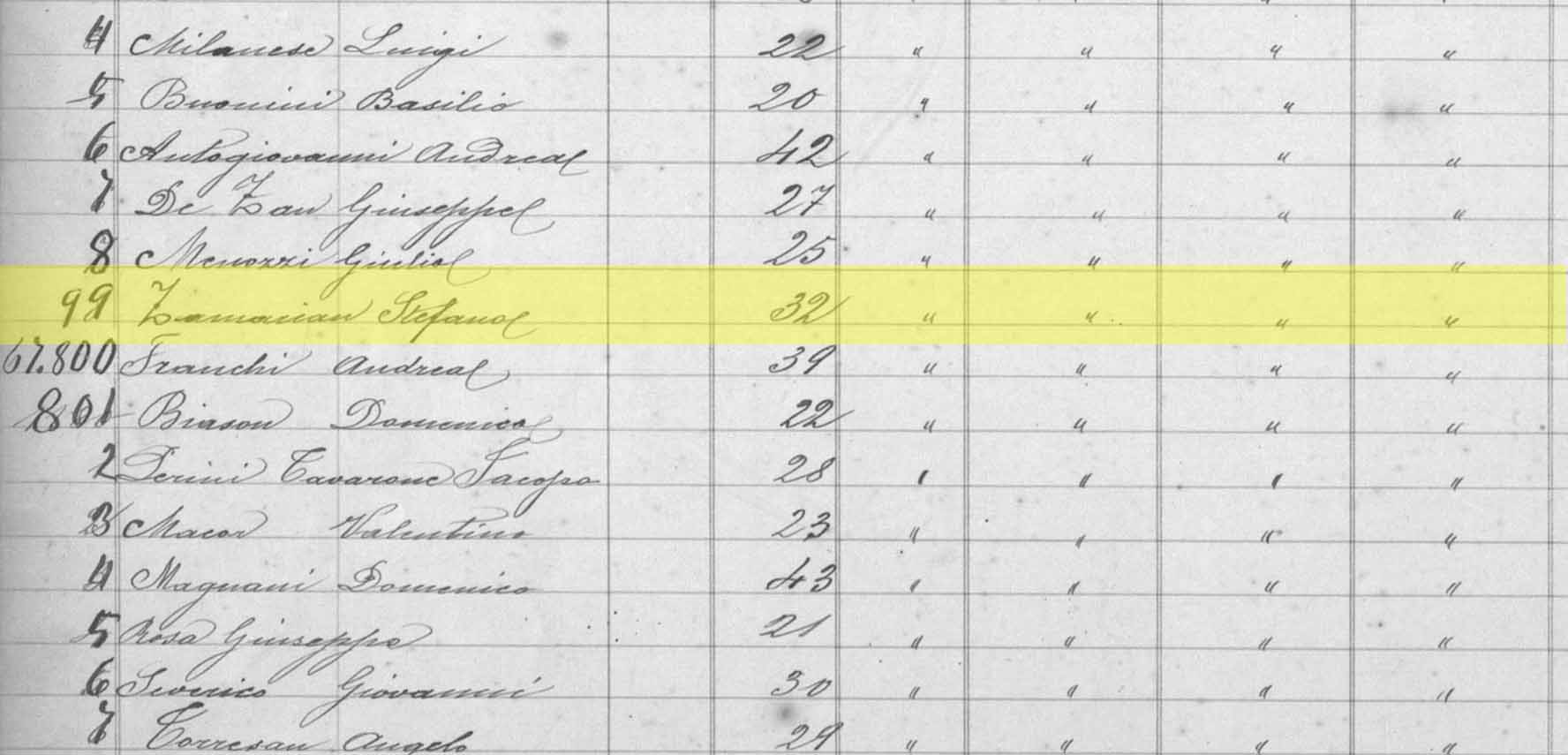 Registro de matrícula de emigração de Stefano Zamarian em São Paulo