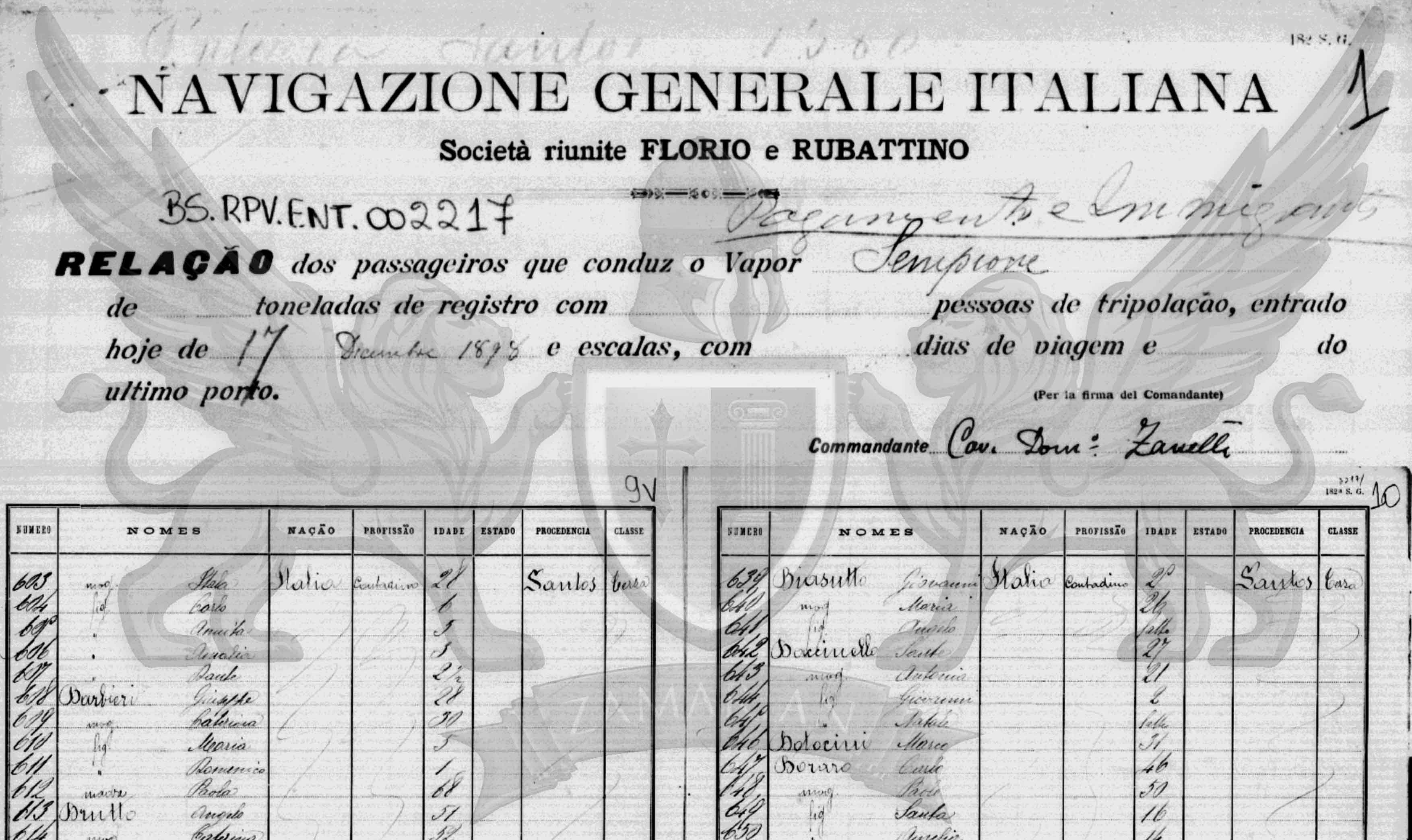 RELAÇÃO de passageiros que conduz o Vapor Sempione de .... toneladas de registro com ...... pessoas de tripulação, entrando hpje de 17 de dezembro 1898 e escalas, com ..... dias de viajem e do último porto.