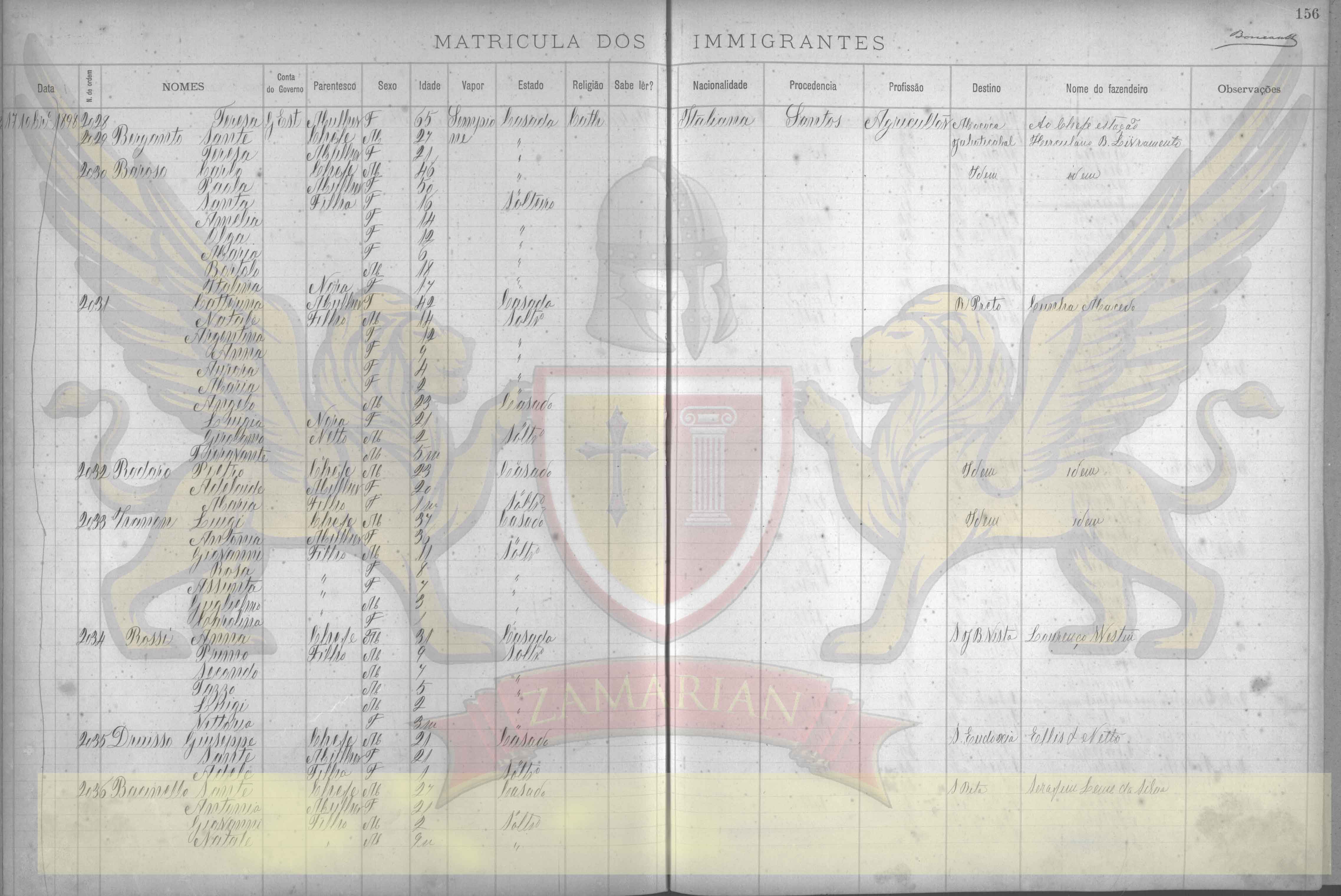 Nº de ordem 2036 Baccinello Sante, Parentesco Chefe, Sexo Masculino, Idade 27, Vapor Sempione, Estado Casado, Religião Católica, Nacionalidade Italiana, Procedência Santos, Profissão agricultor, Destino Santa Rita, Nome do Fazendeiro Serafin Leme da Silva